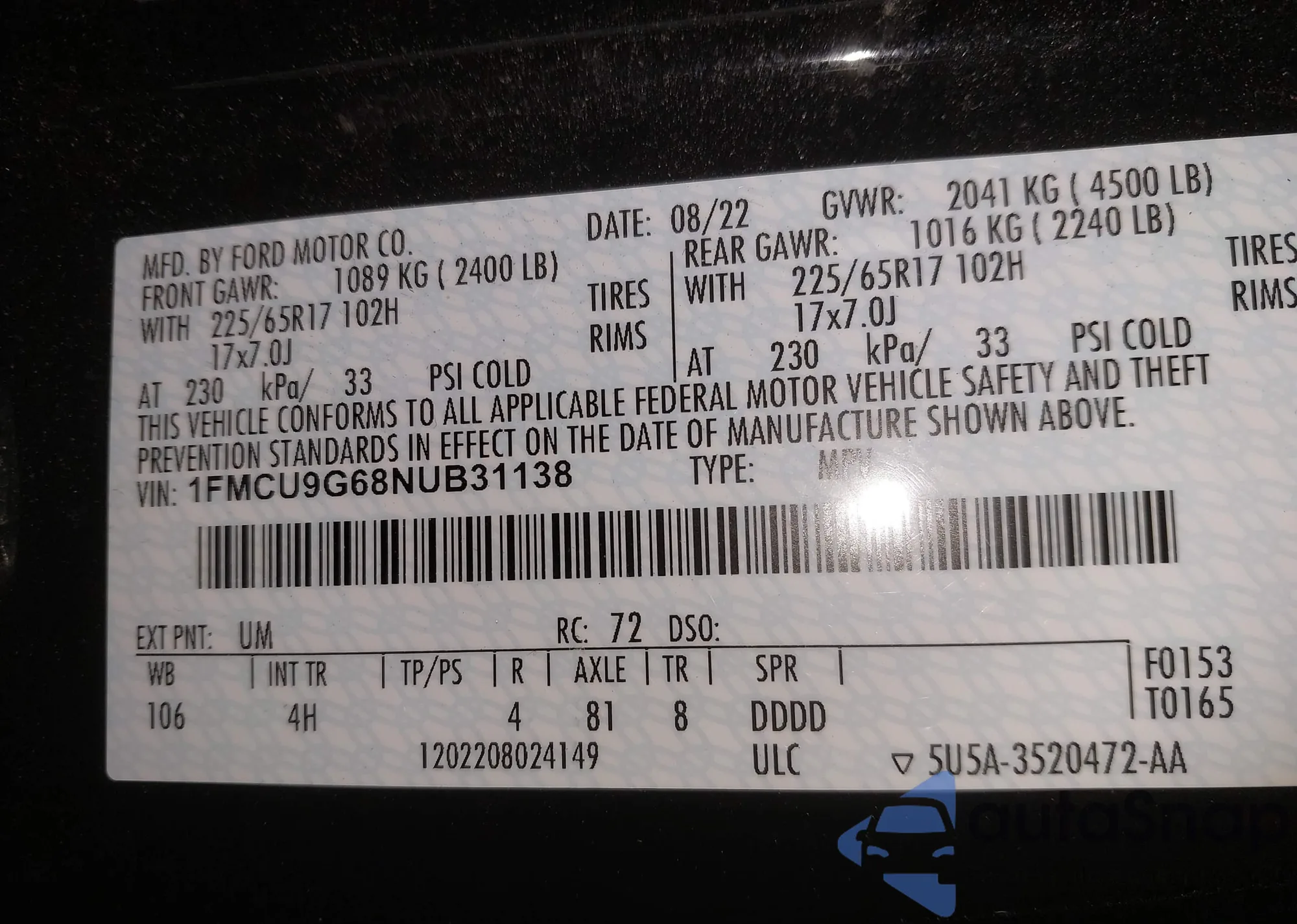 • VIN 1FMCU9G68NUB31138