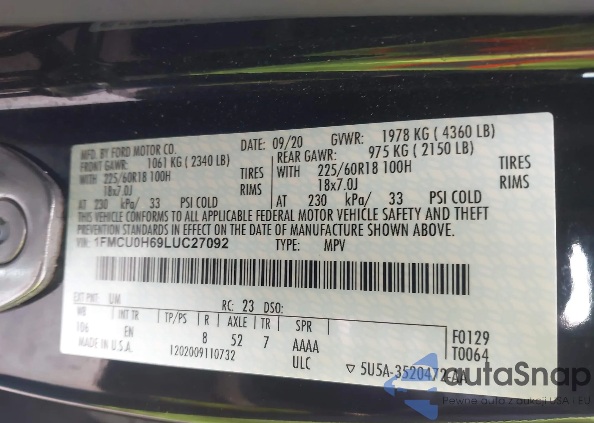 LOT: 44291363 VIN: 1FMCU0H69LUC27092