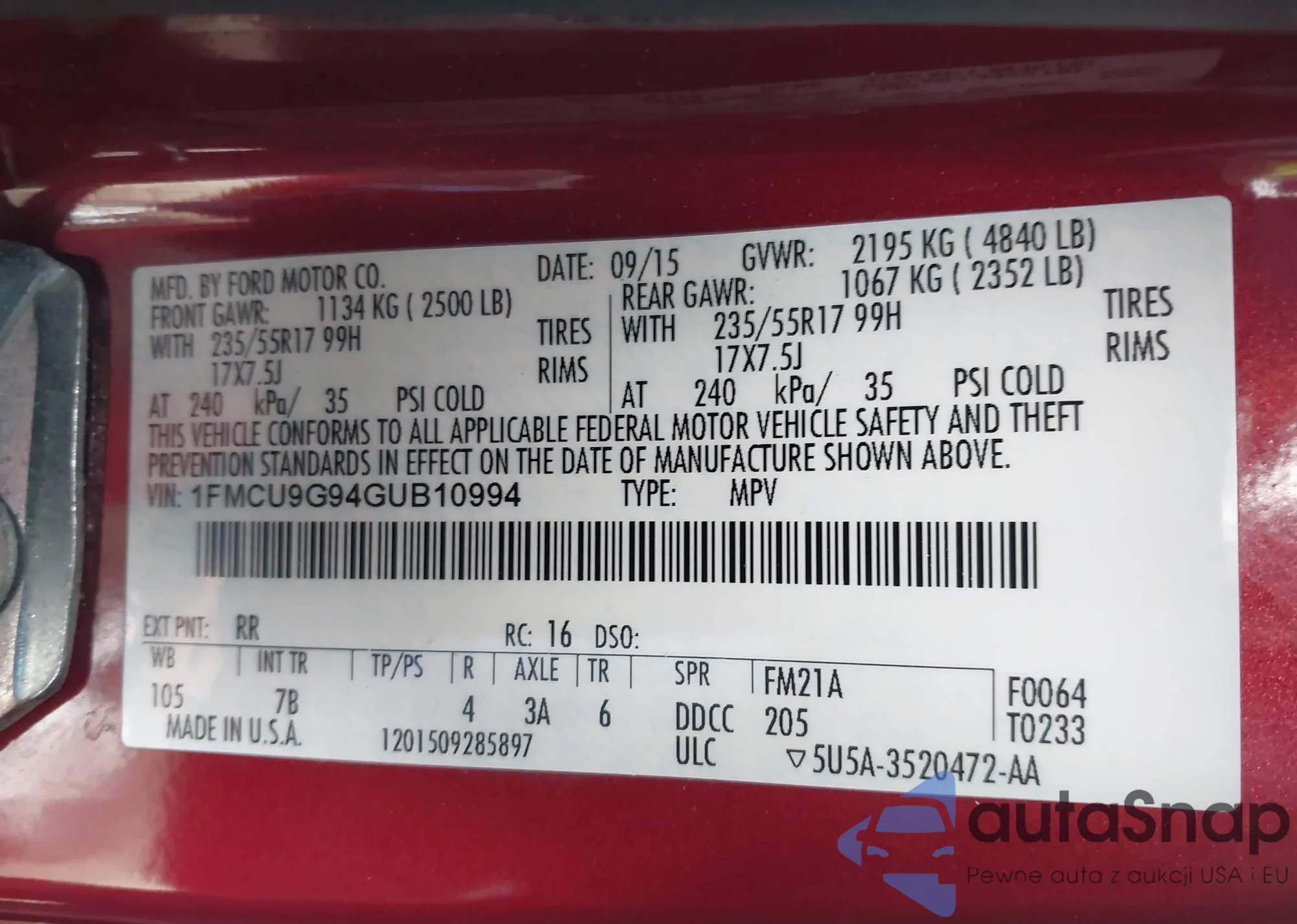 • VIN 1FMCU9G94GUB10994