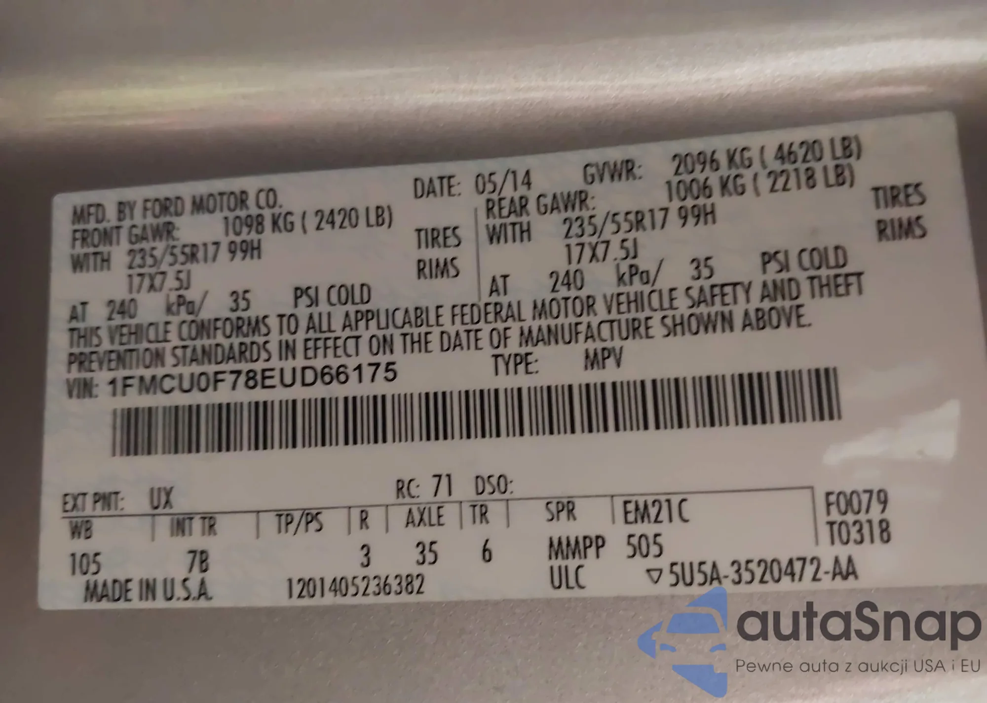 LOT: 43627542 VIN: 1FMCU0F78EUD66175