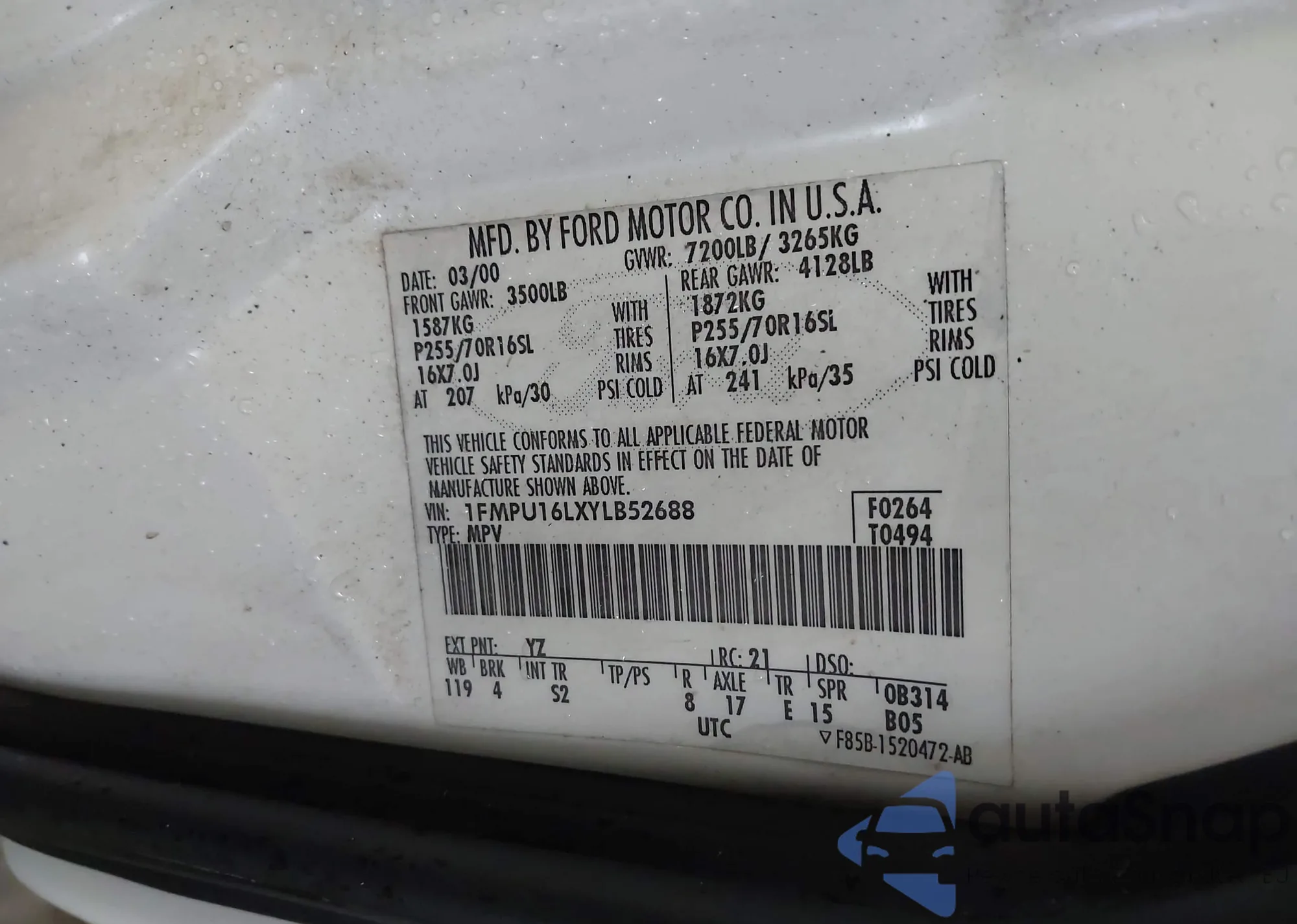 • VIN 1FMPU16LXYLB52688