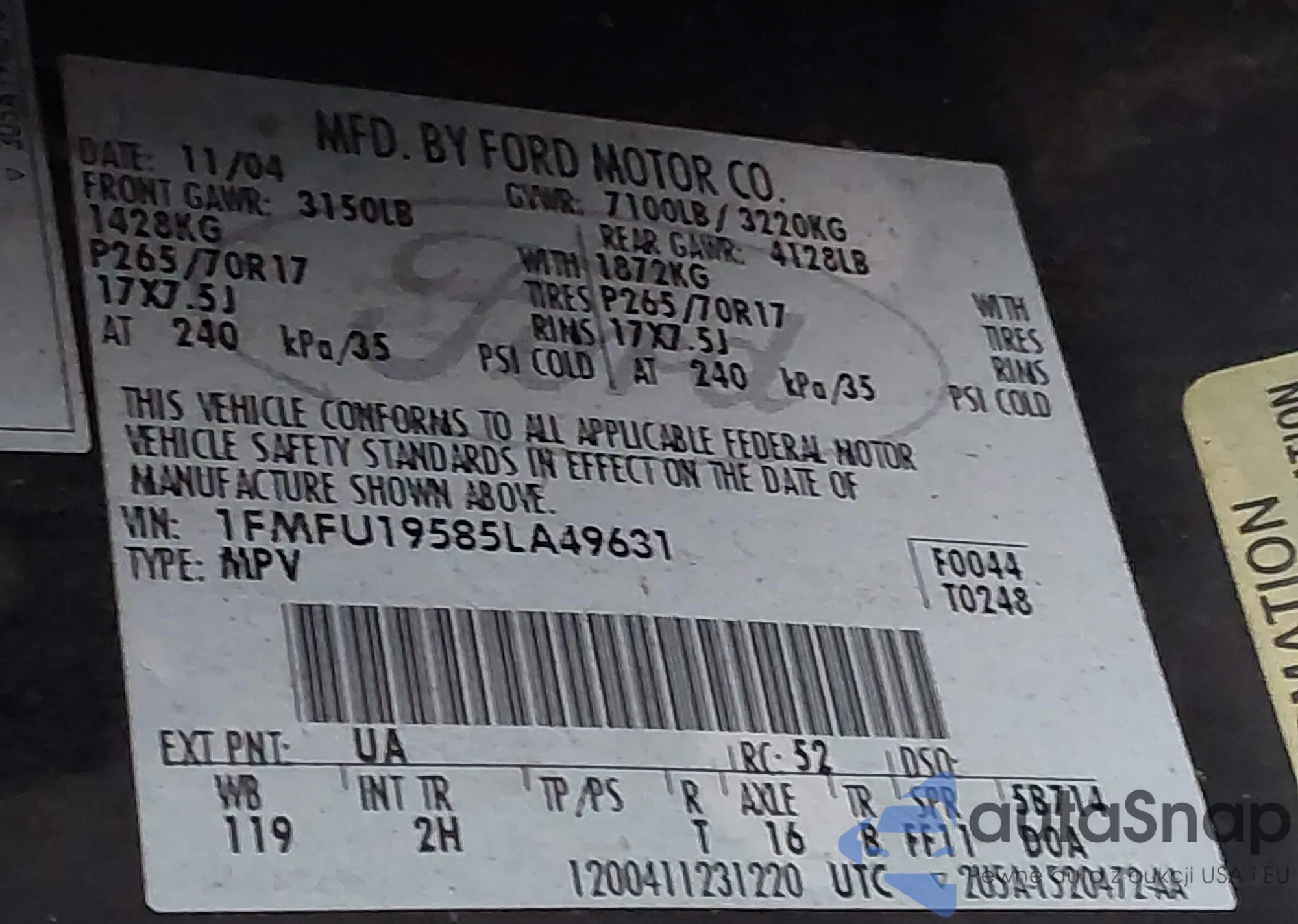 LOT: 43984809 VIN: 1FMFU19585LA49631
