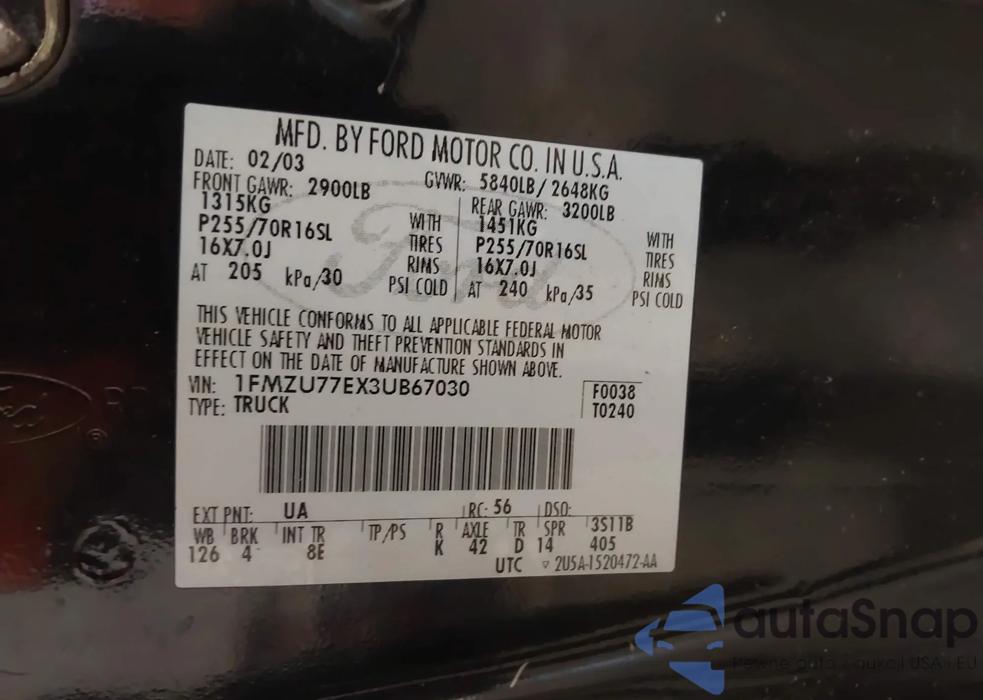 • VIN 1FMZU77EX3UB67030