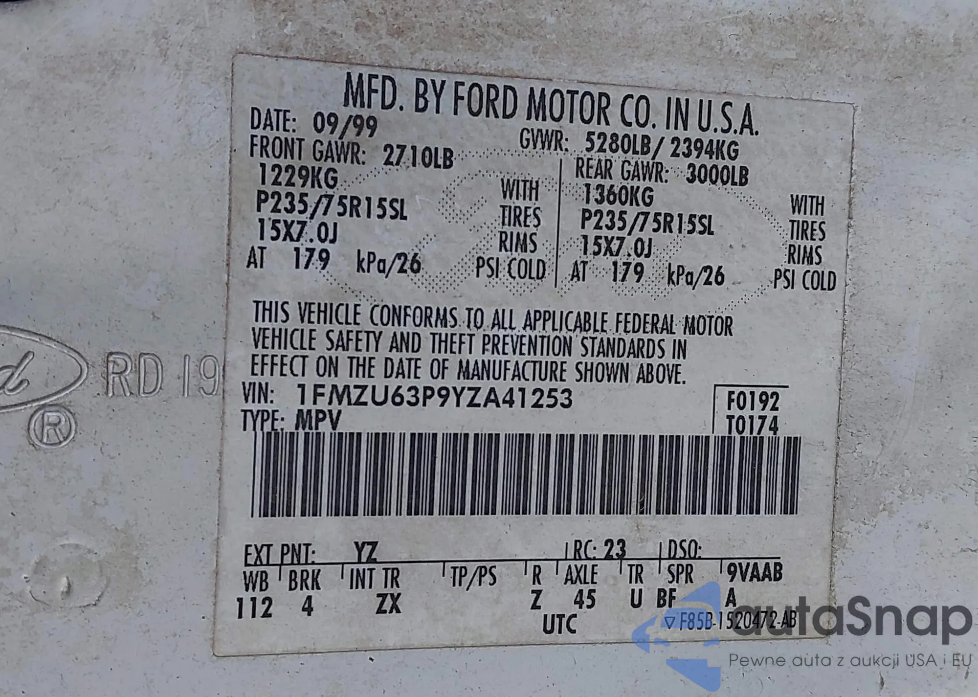 LOT: 43999223 VIN: 1FMZU63P9YZA41253