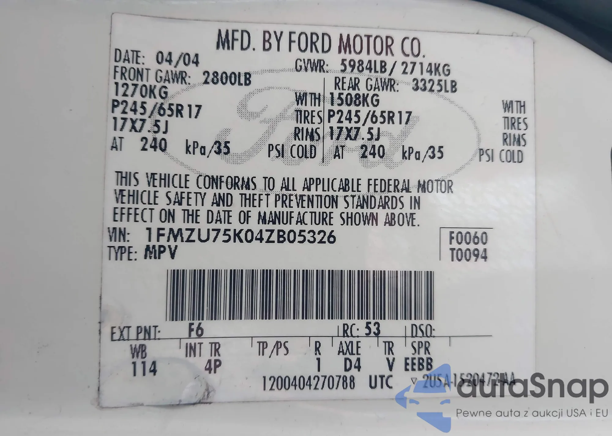 • VIN 1FMZU75K04ZB05326