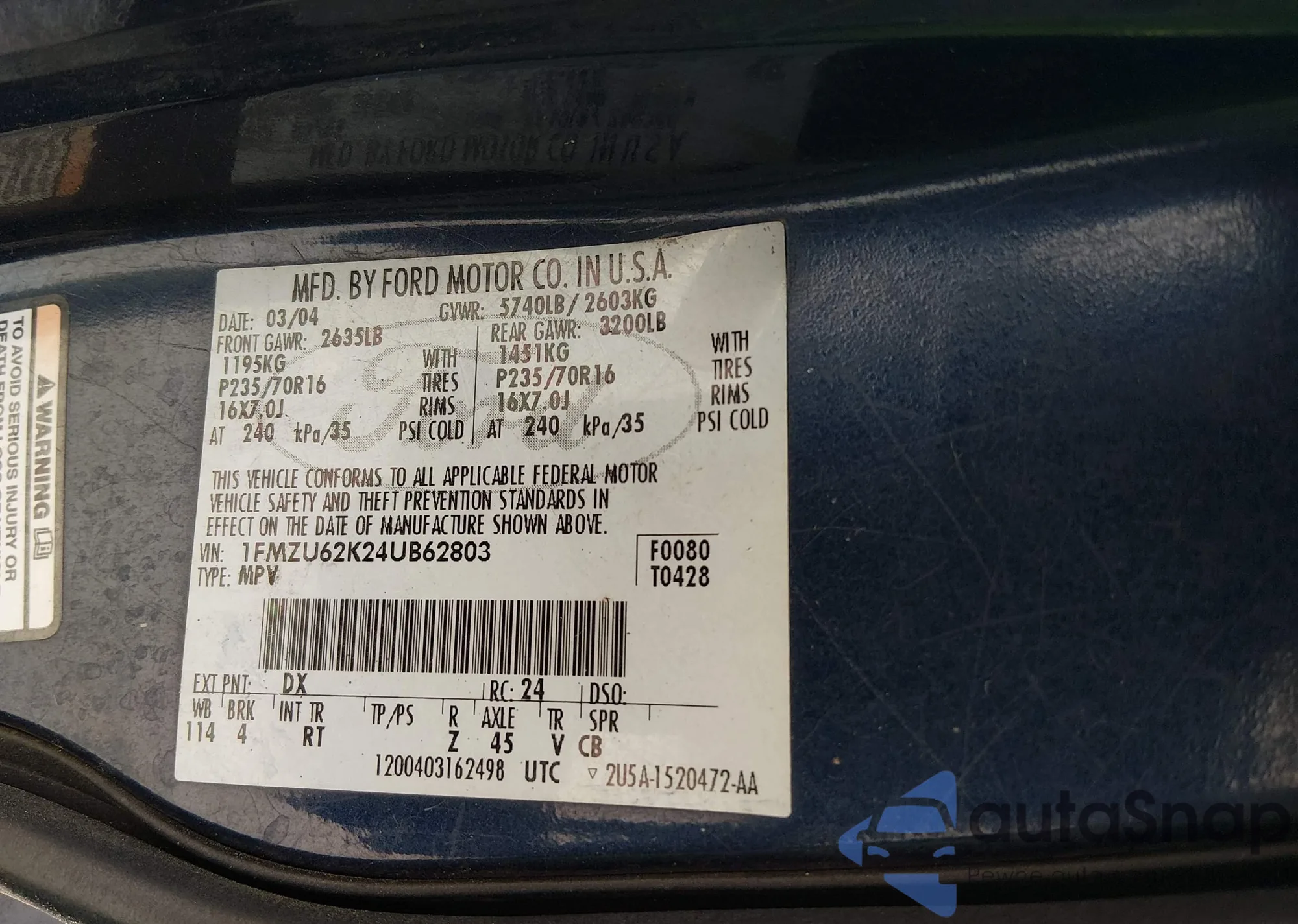 • VIN 1FMZU62K24UB62803