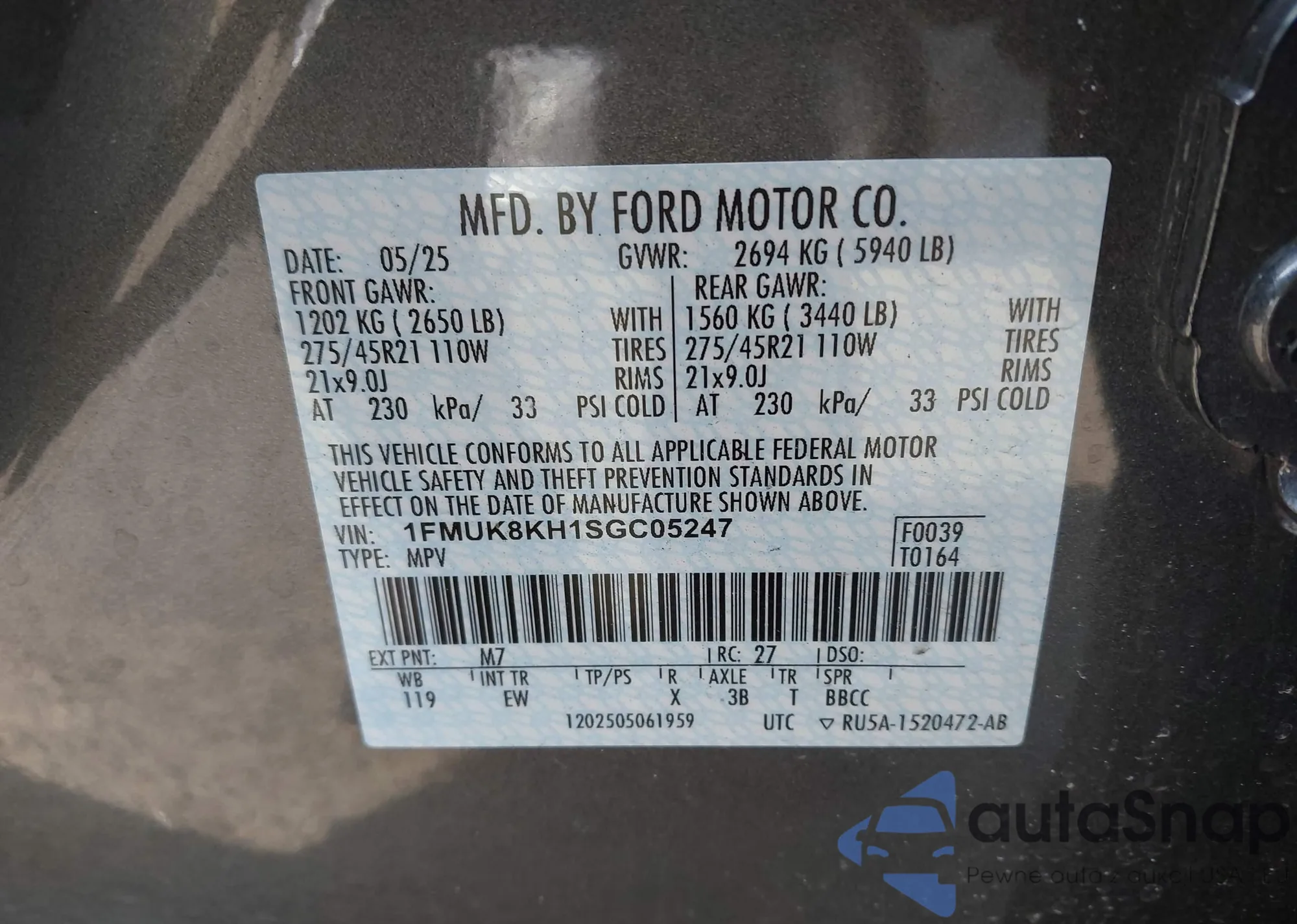 • VIN 1FMUK8KH1SGC05247