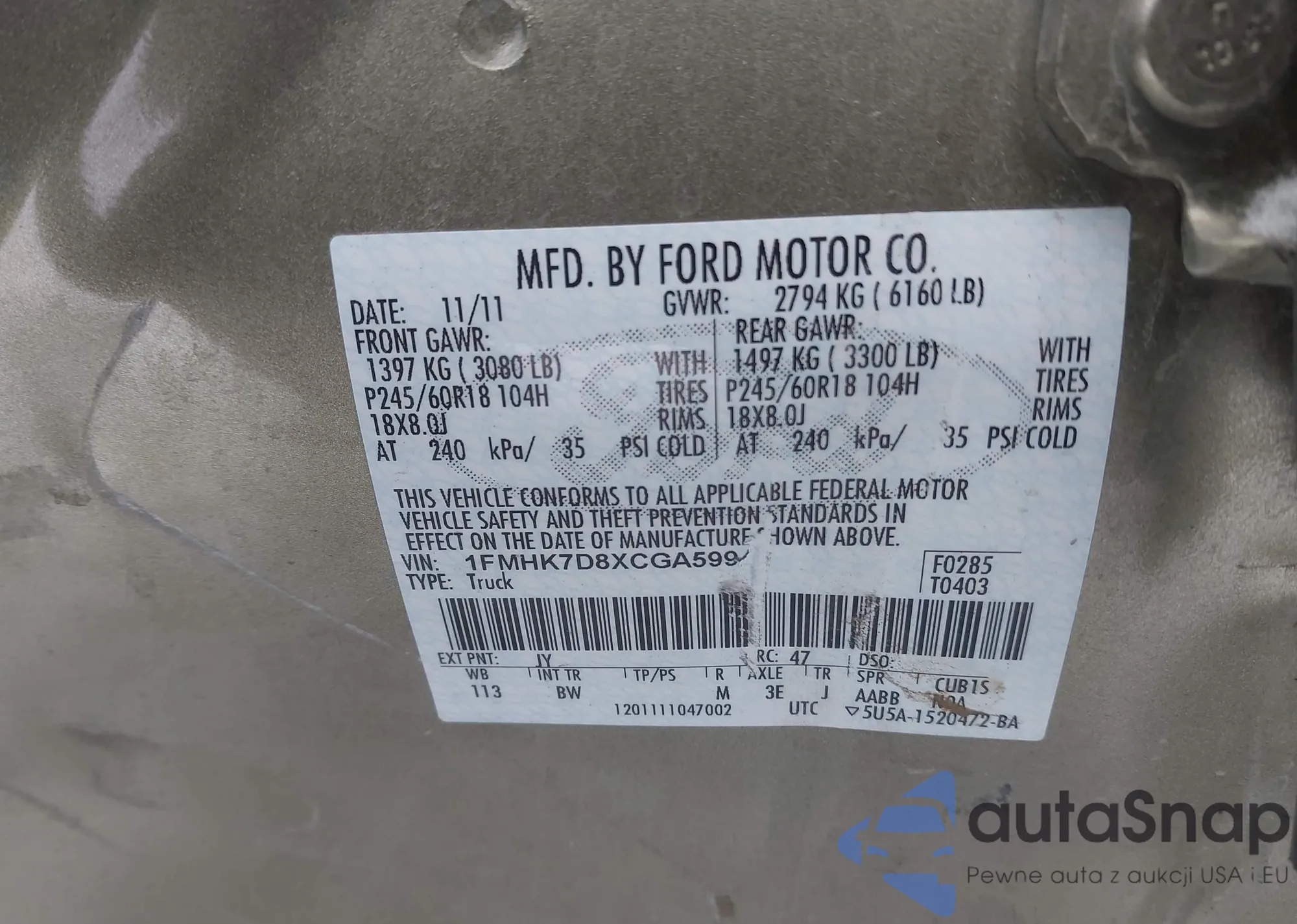 LOT: 43814059 VIN: 1FMHK7D8XCGA59943