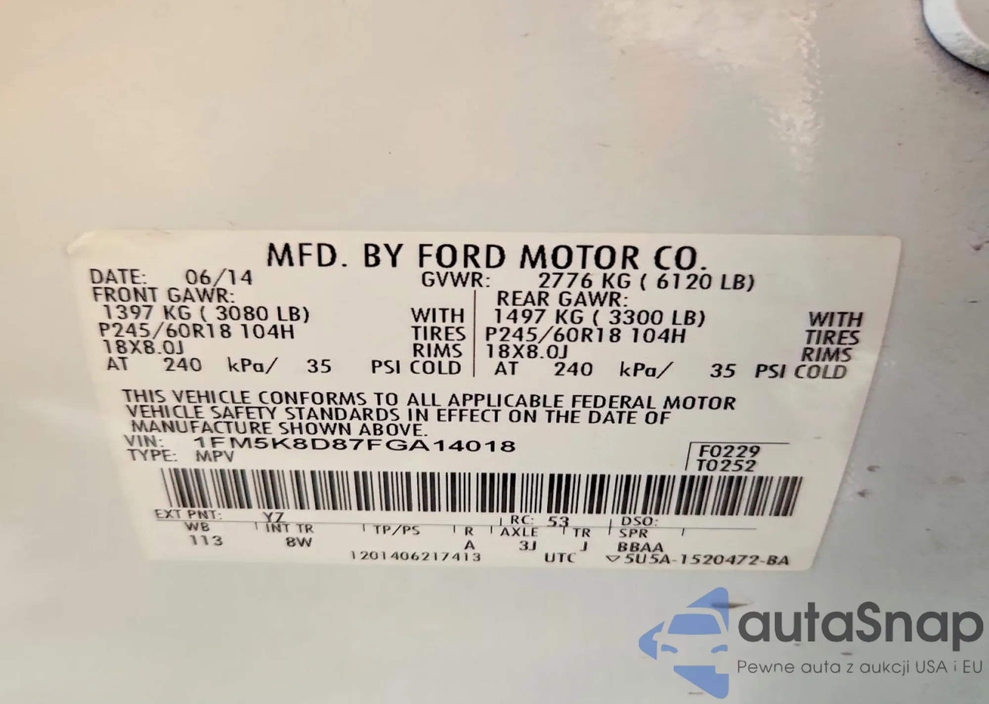 LOT: 76998505 VIN: 1FM5K8D87FGA14018