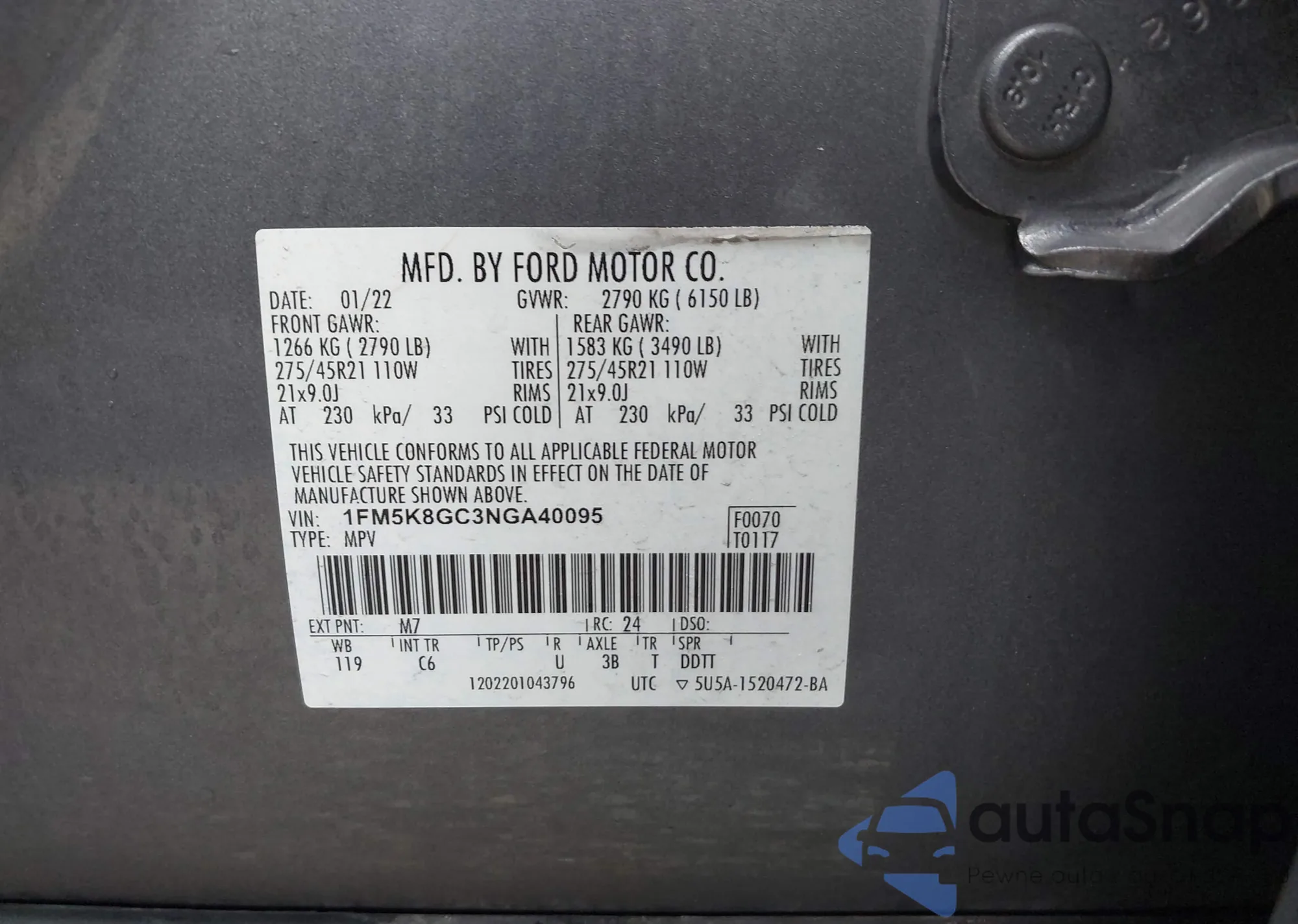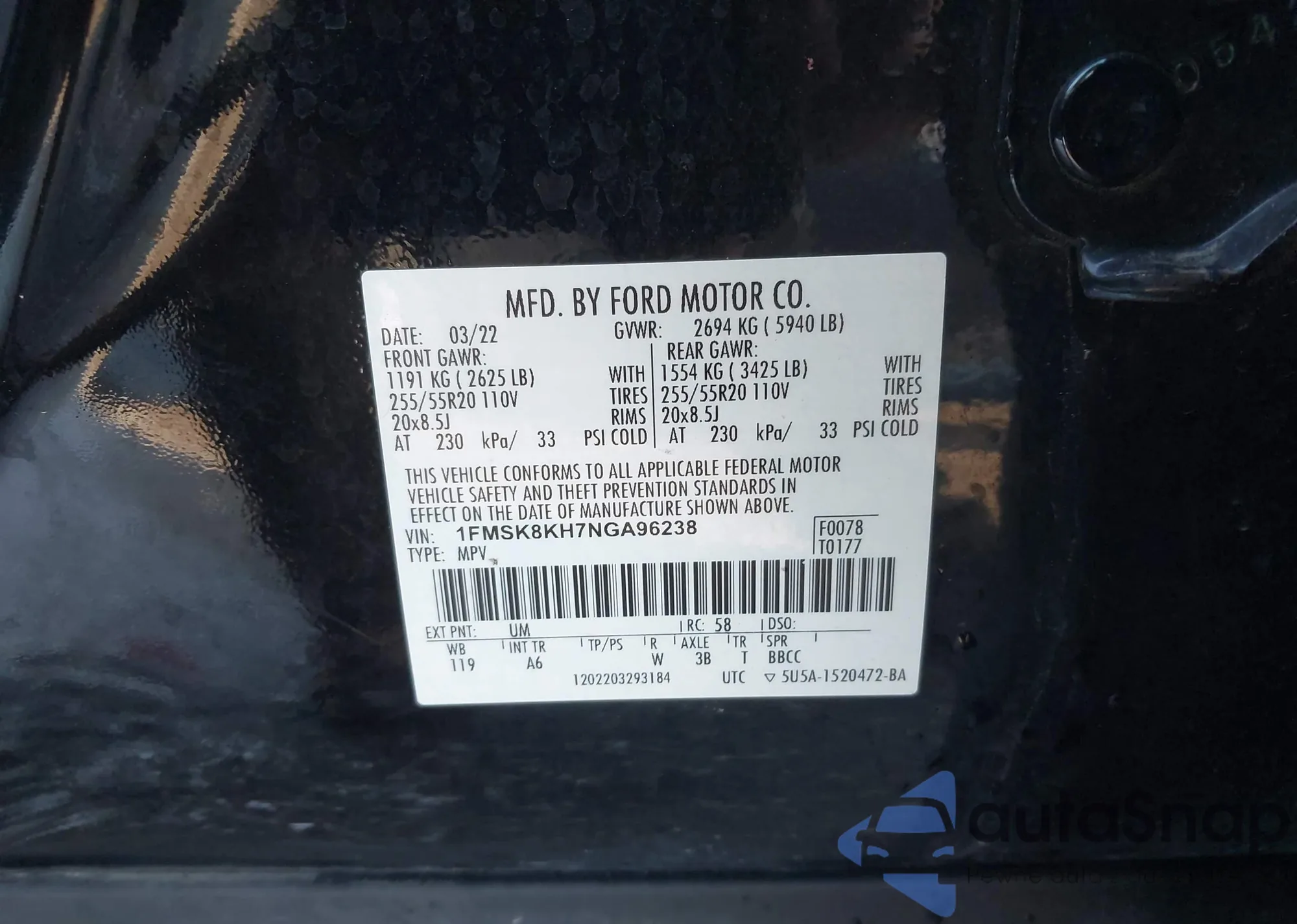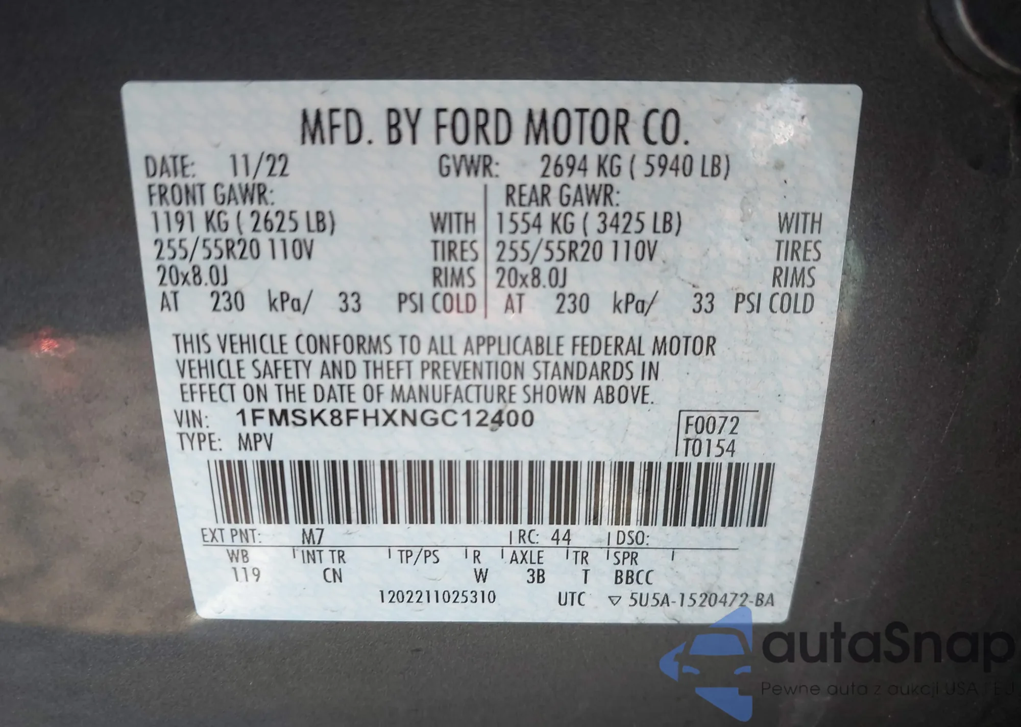 LOT: 44107961 VIN: 1FMSK8KH7NGA96238