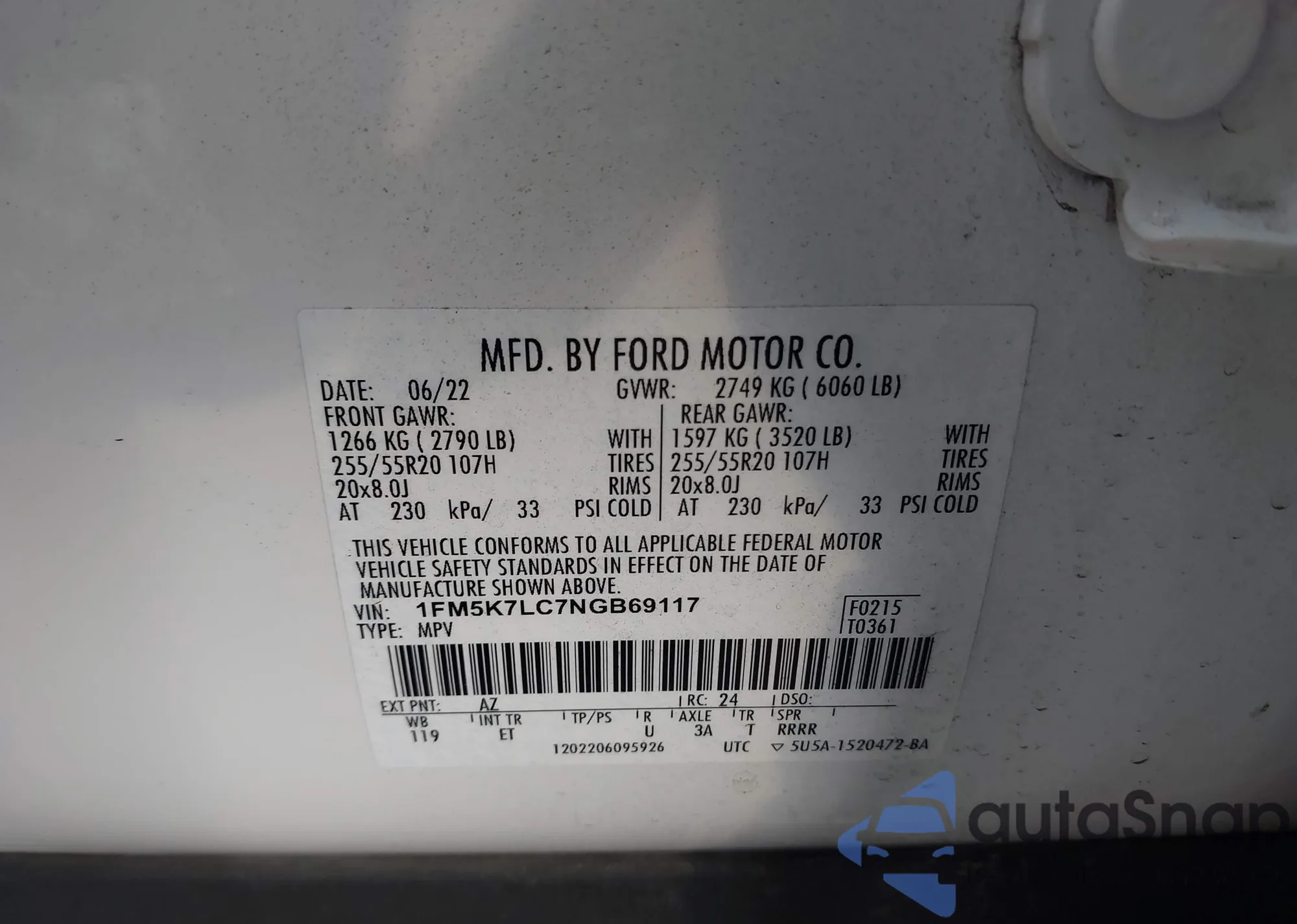 • VIN 1FM5K7LC7NGB69117