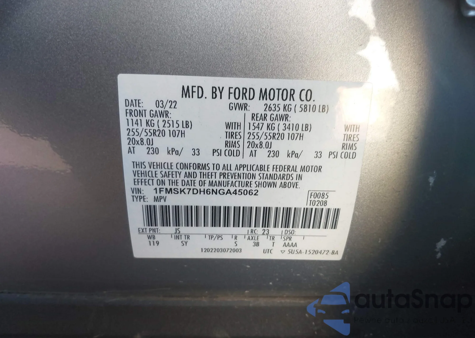 LOT: 44318630 VIN: 1FMSK7DH6NGA45062