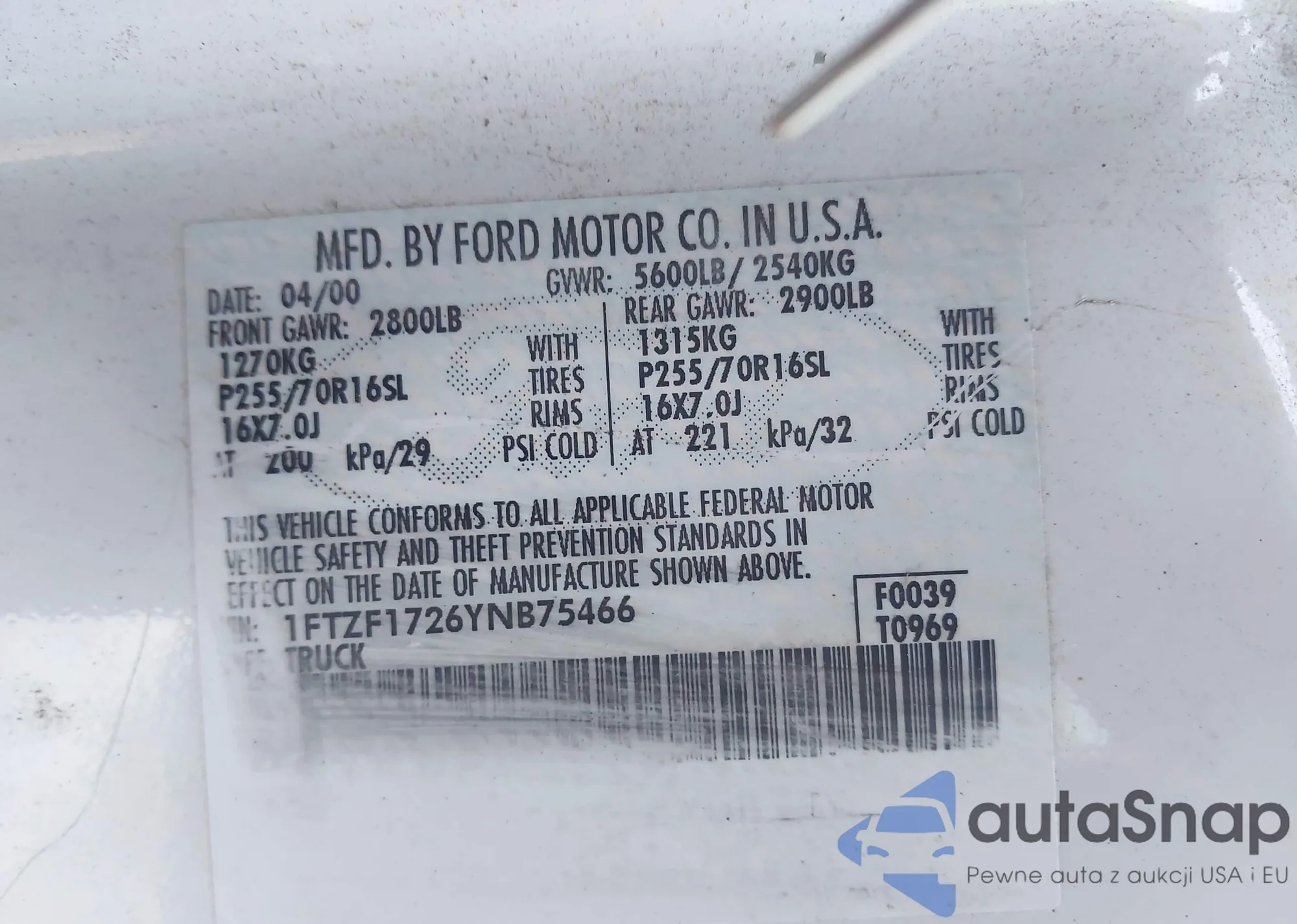 LOT: 44173215 VIN: 1FTZF1726YNB75466