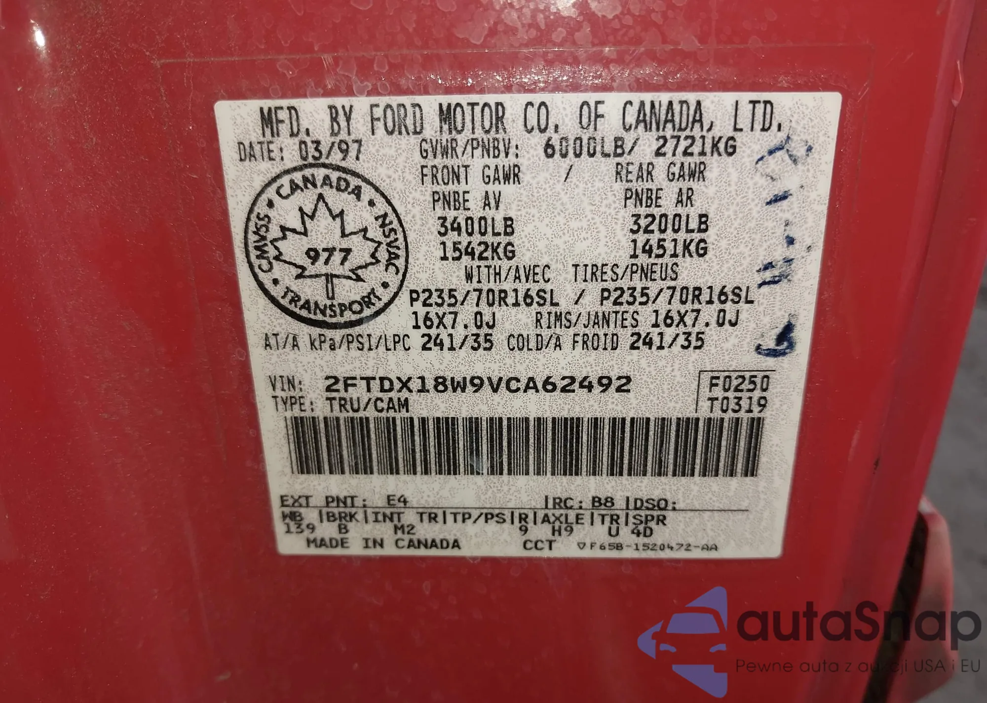 • VIN 2FTDX18W9VCA62492