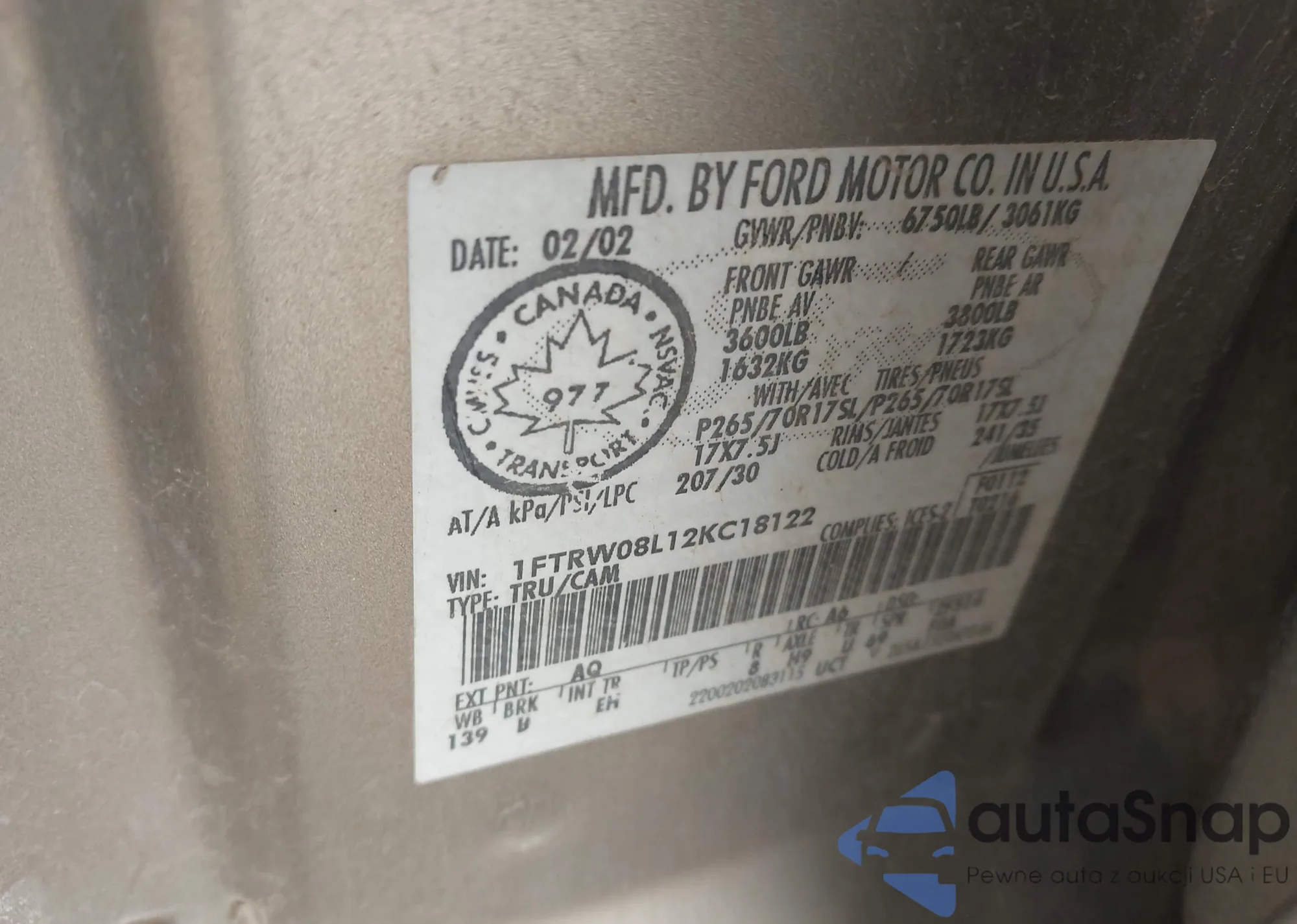 • VIN 1FTRW08L12KC18122