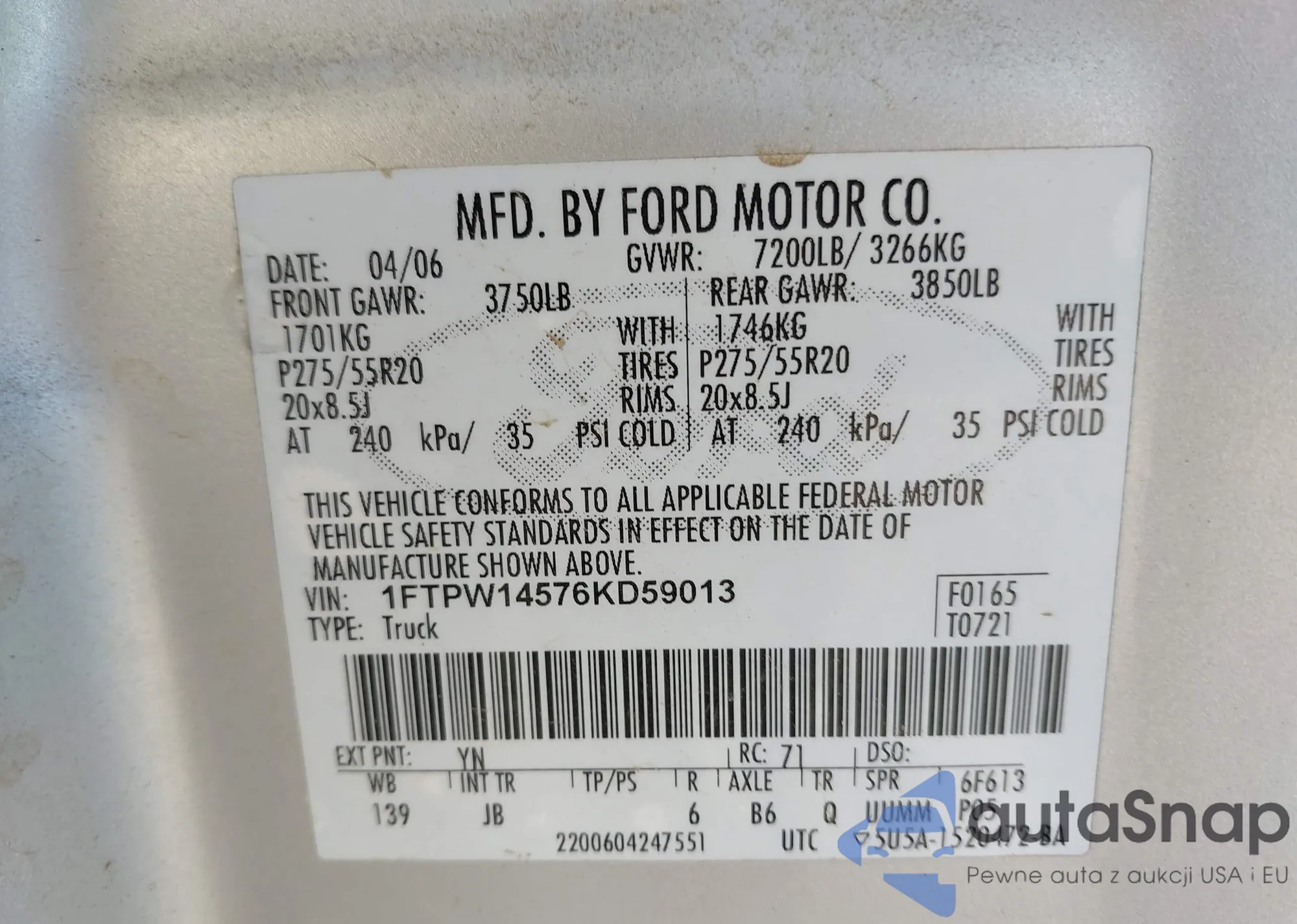 LOT: 44550812 VIN: 1FTPW14576KD59013