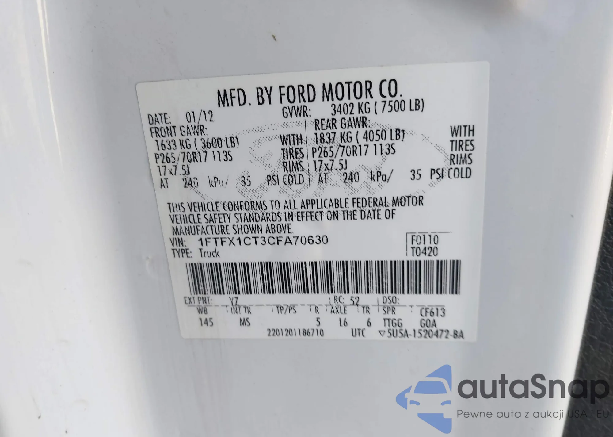 LOT: 44211714 VIN: 1FTFX1CT3CFA70630