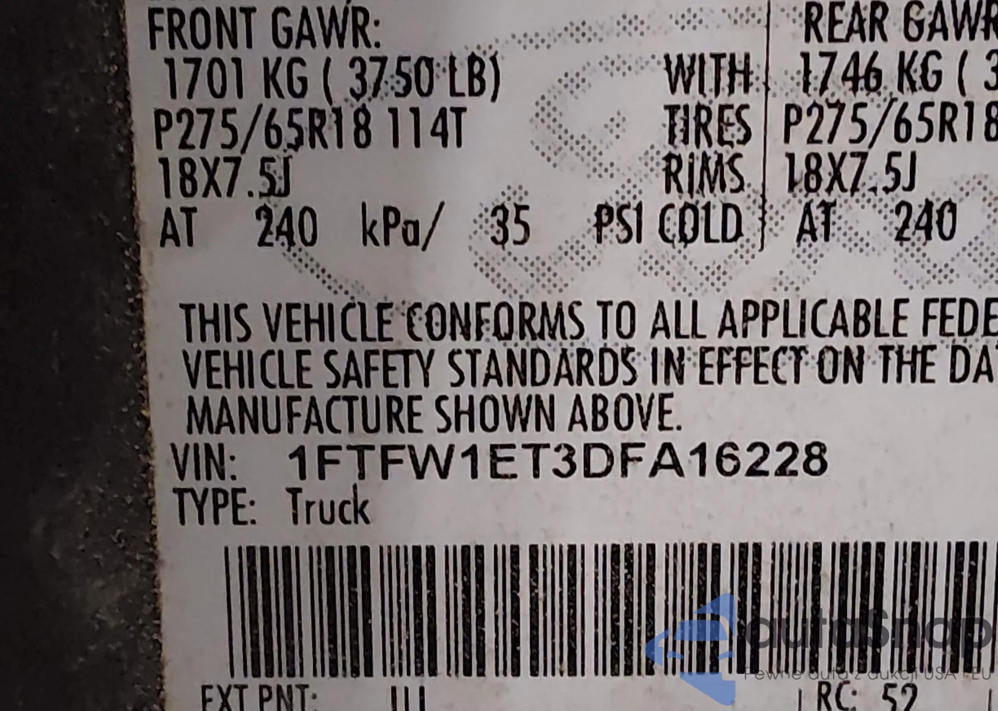 • VIN 1FTFW1ET3DFA16228