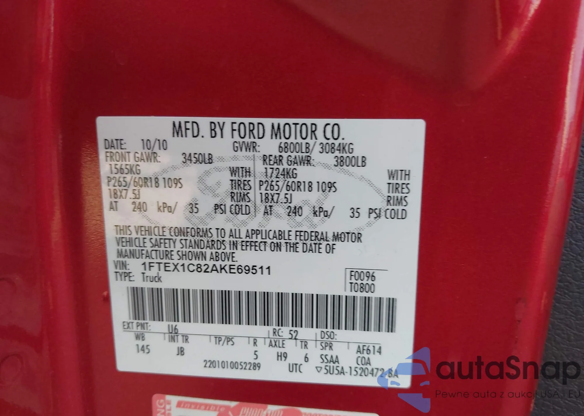LOT: 44245900 VIN: 1FTFW1EV8AFC46943