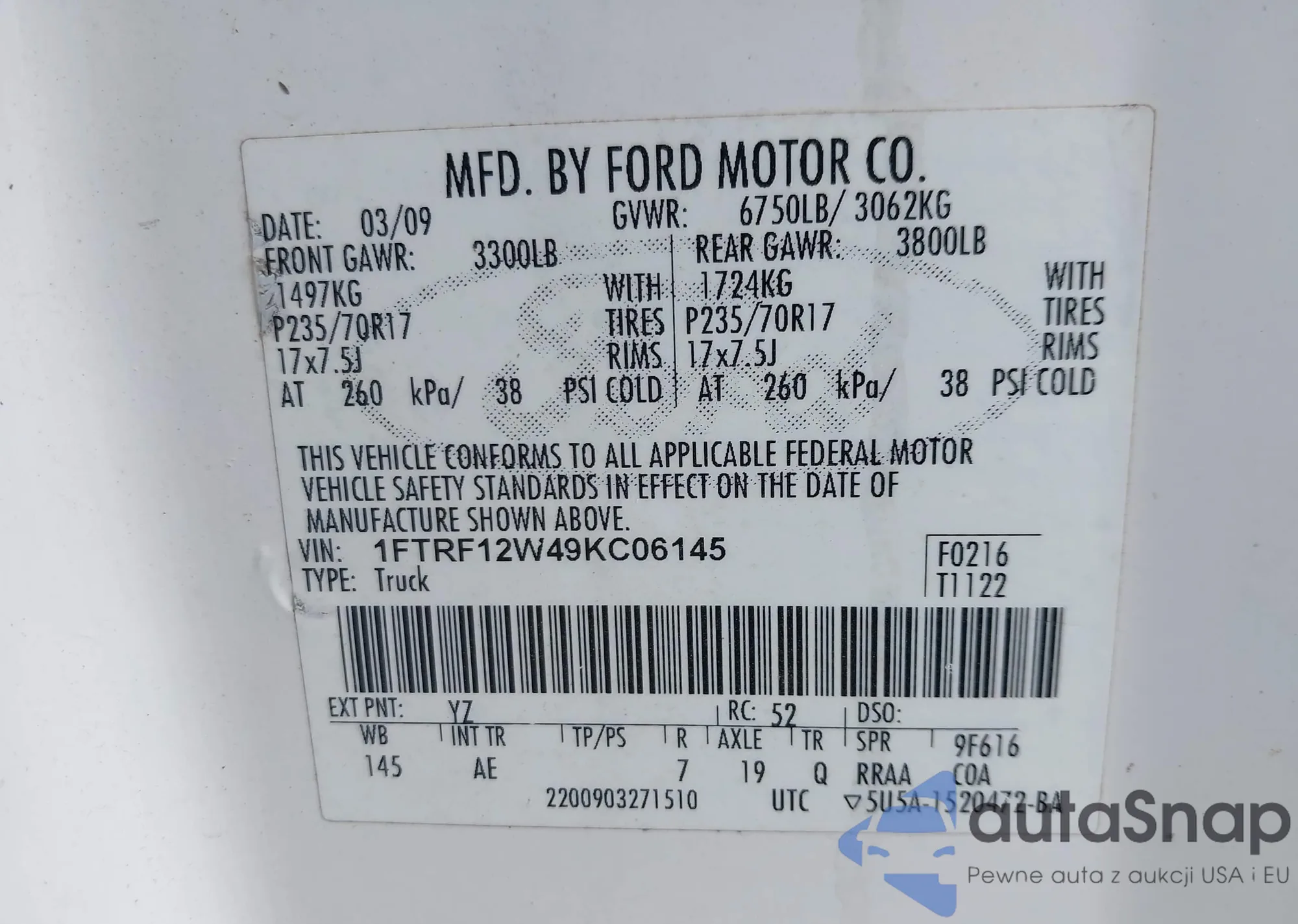 LOT: 44032266 VIN: 1FTRF12W49KC06145