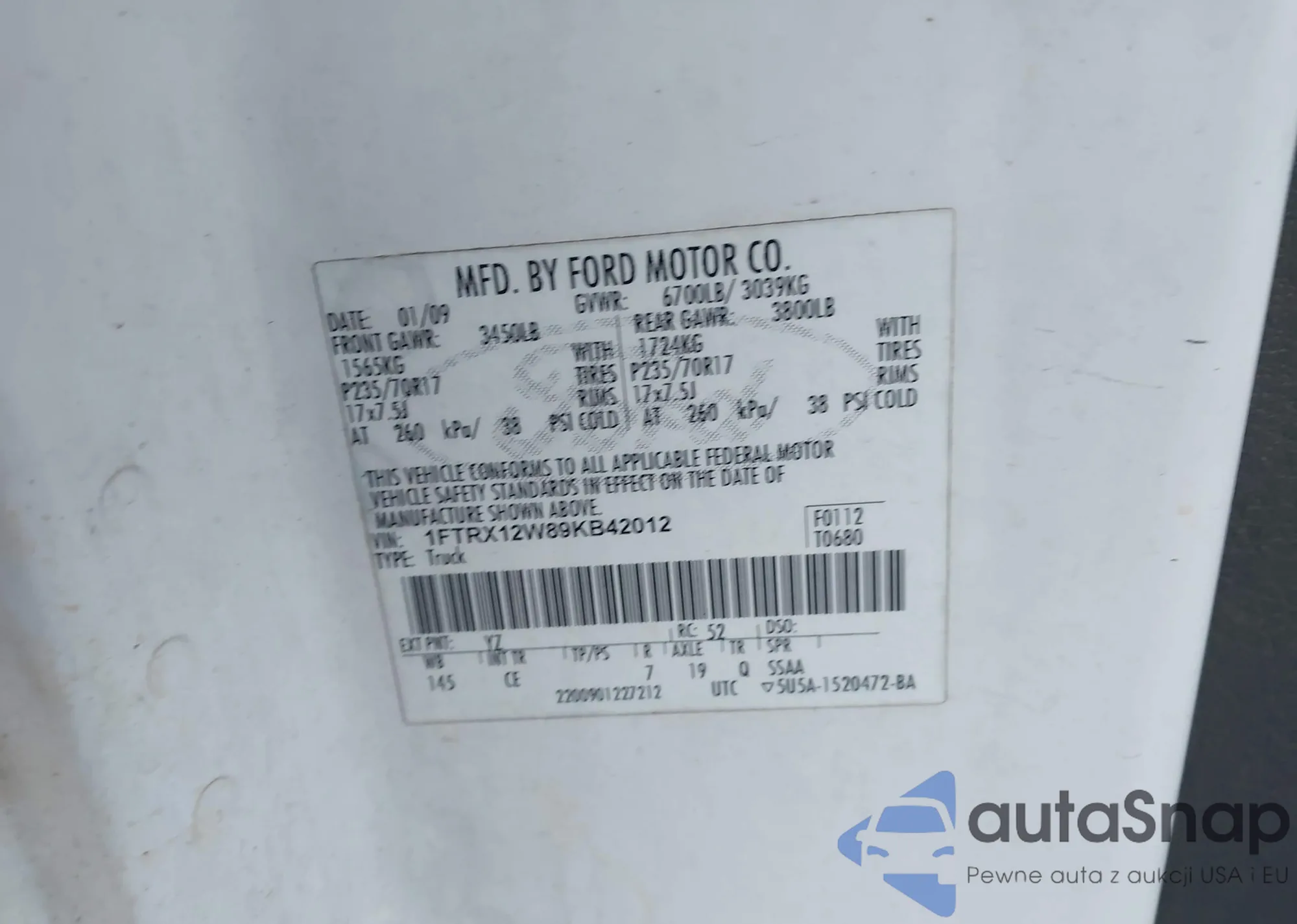 • VIN 1FTRX12W89KB42012
