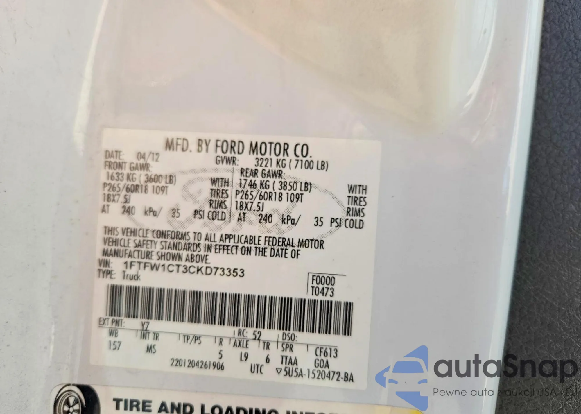 • VIN 1FTFW1CT3CKD73353
