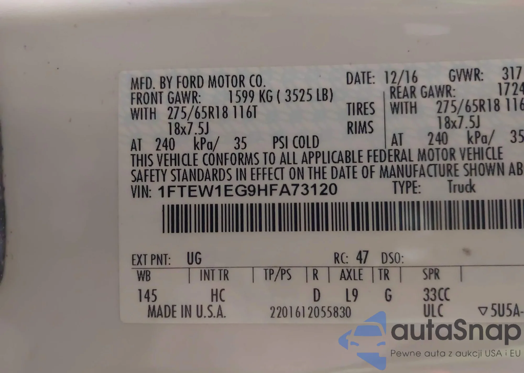 LOT: 43109666 VIN: 1FTEW1EG9HFA73120