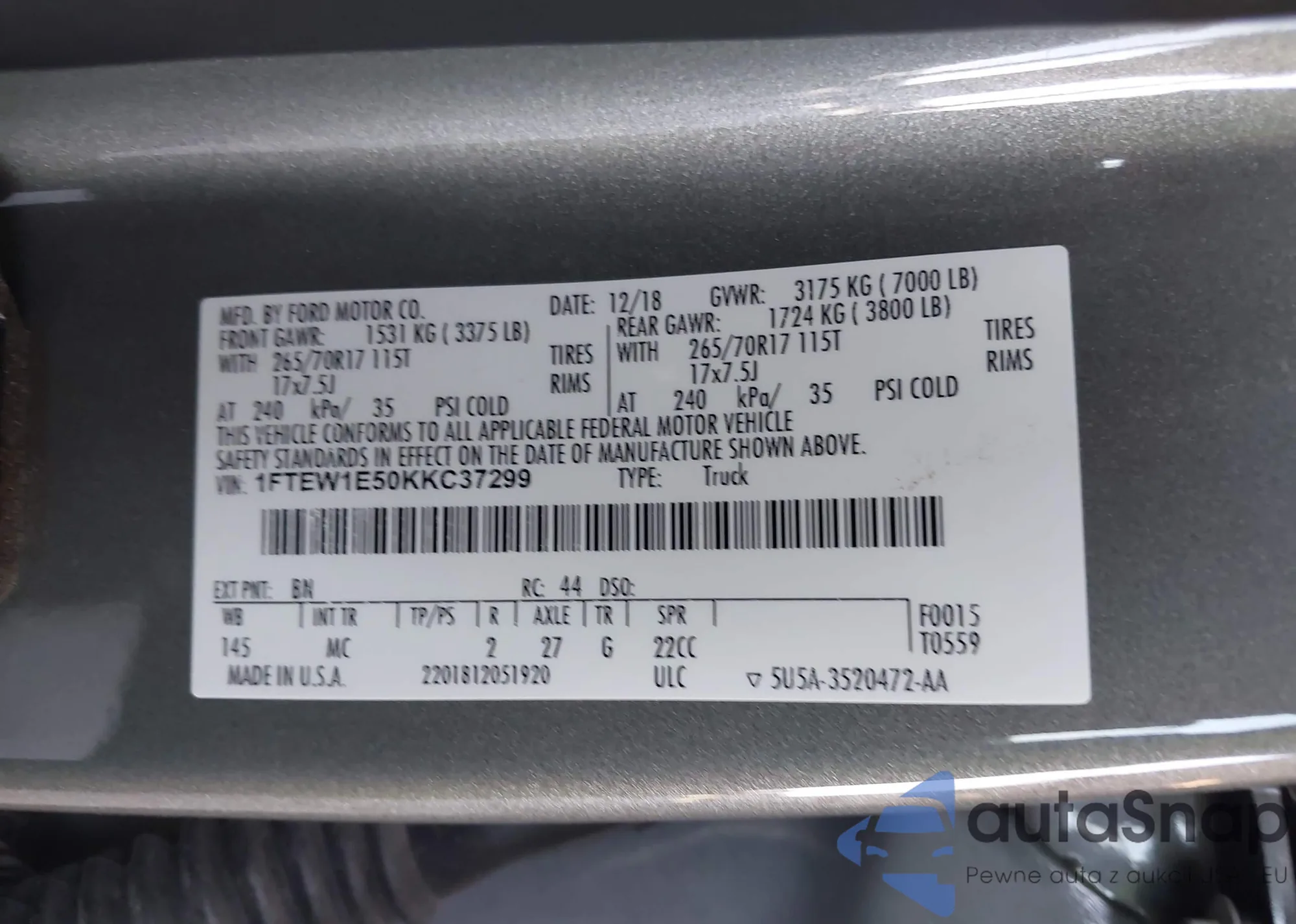 LOT: 43322759 VIN: 1FTEW1E50KKC37299