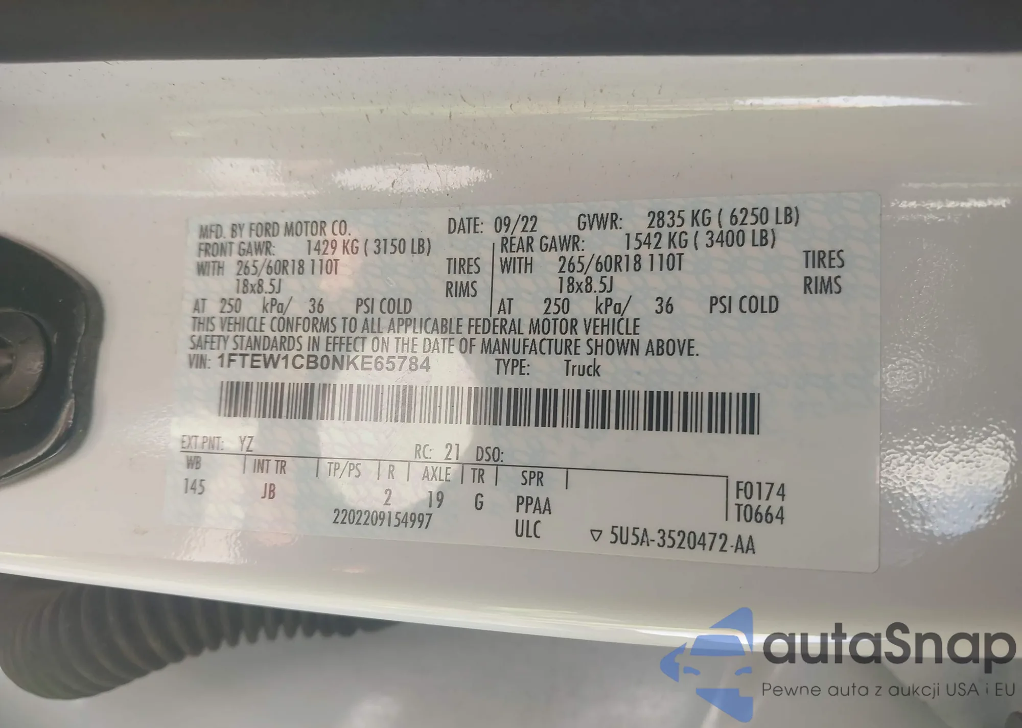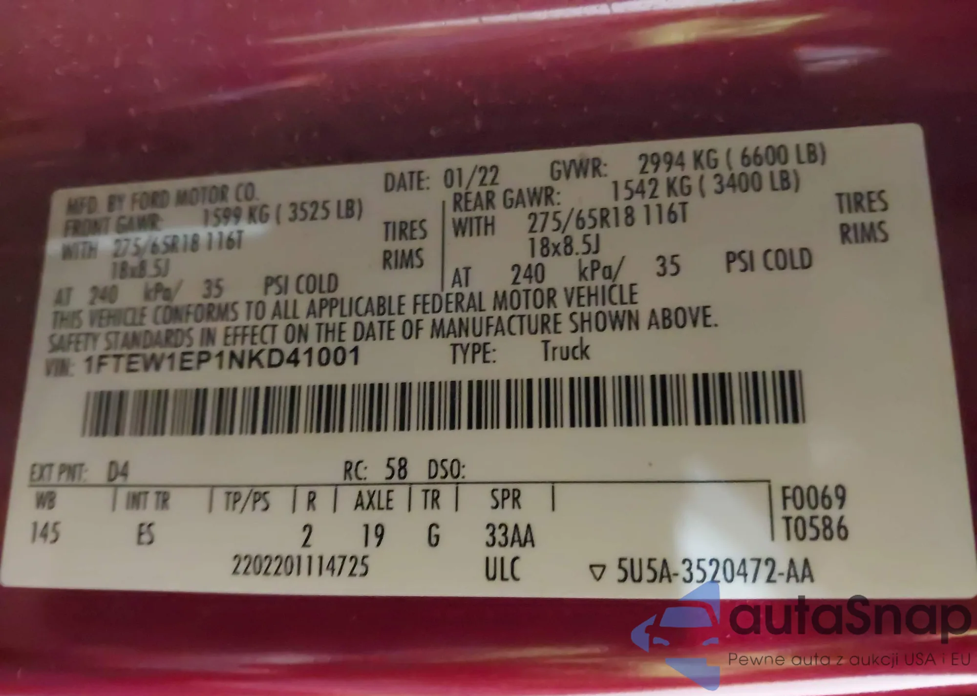LOT: 42209835 VIN: 1FTFW1E5XNKD90085