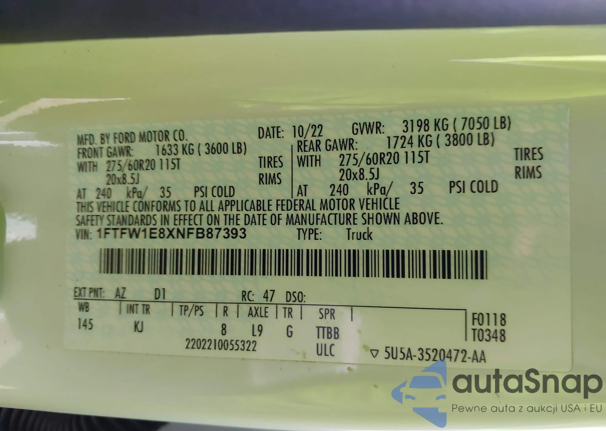 LOT: 44183666 VIN: 1FTFW1E8XNFB87393