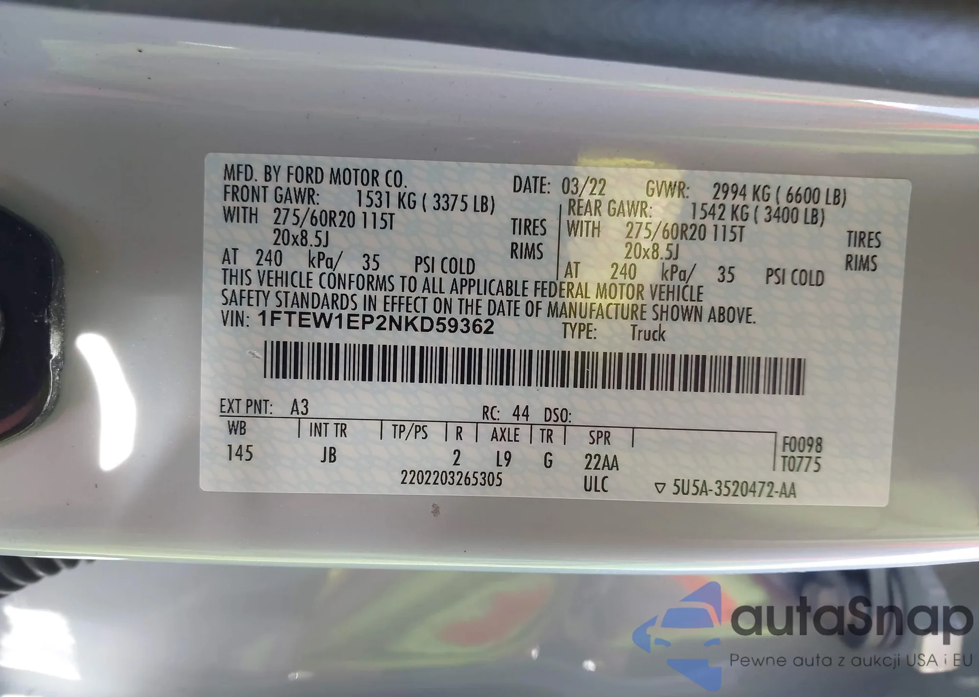 LOT: 44302141 VIN: 1FTFW1E8XNKF22871