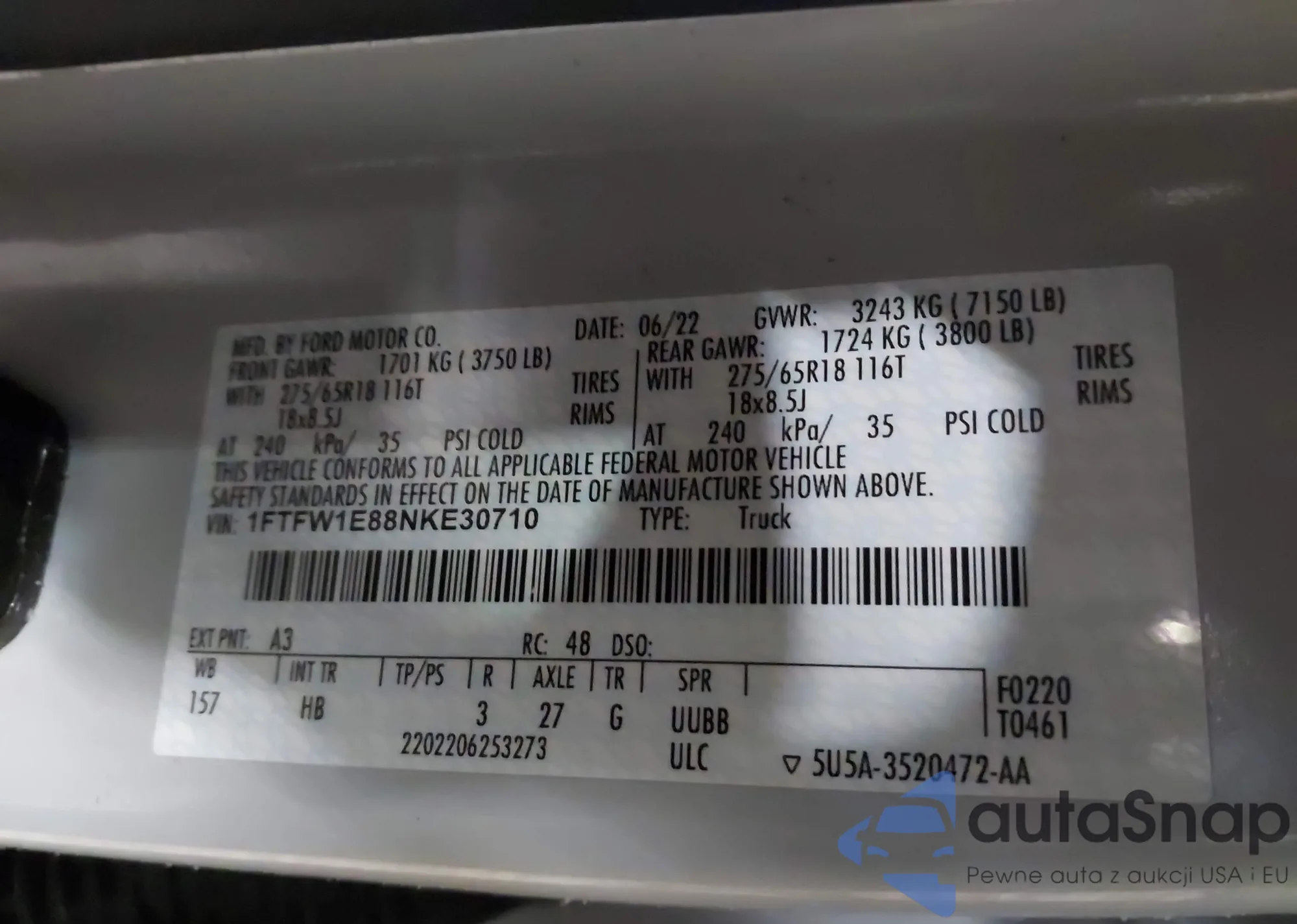 LOT: 44228967 VIN: 1FTFW1E88NKE03197