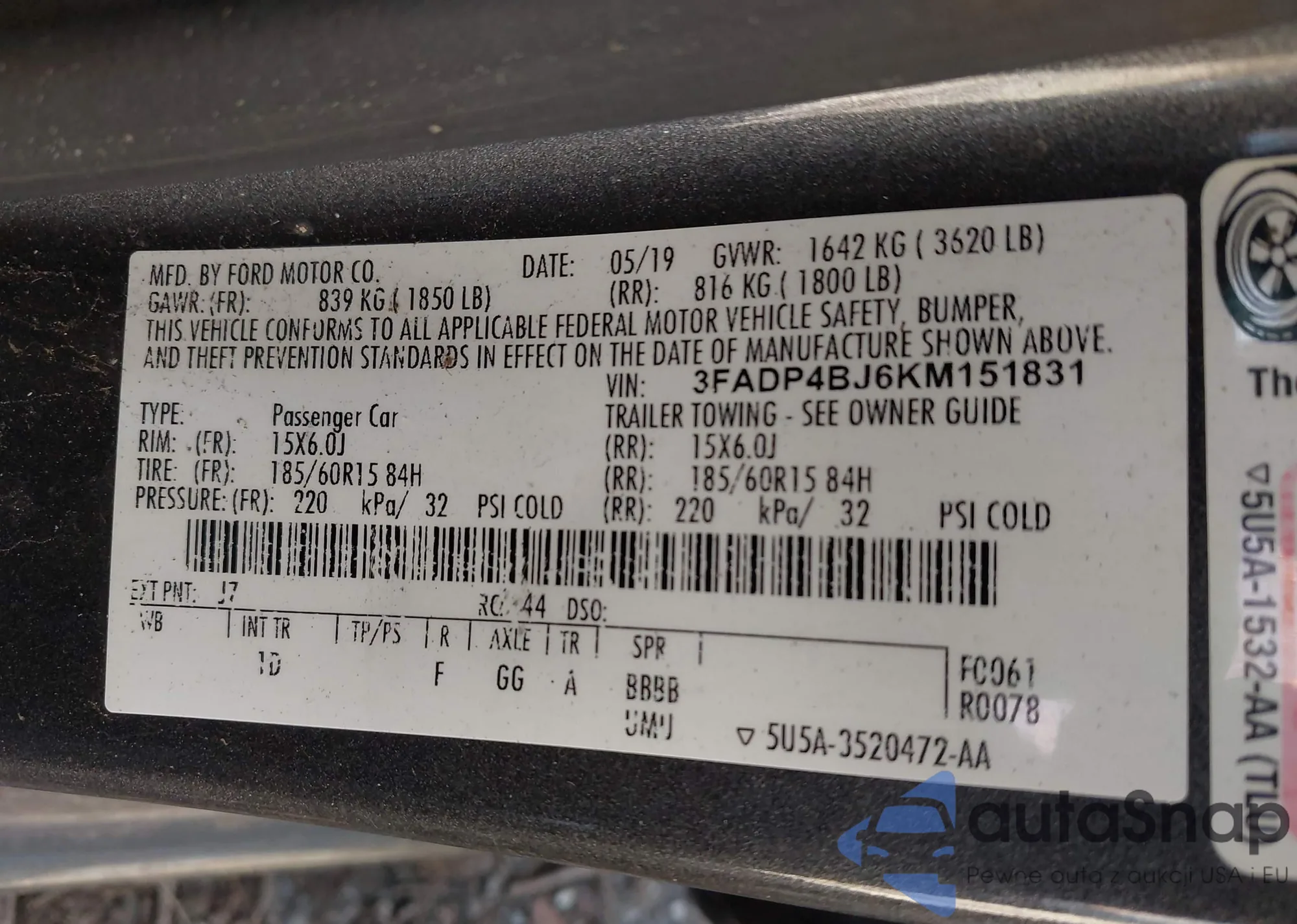 LOT: 41488517 VIN: 3FADP4BJ6KM151831