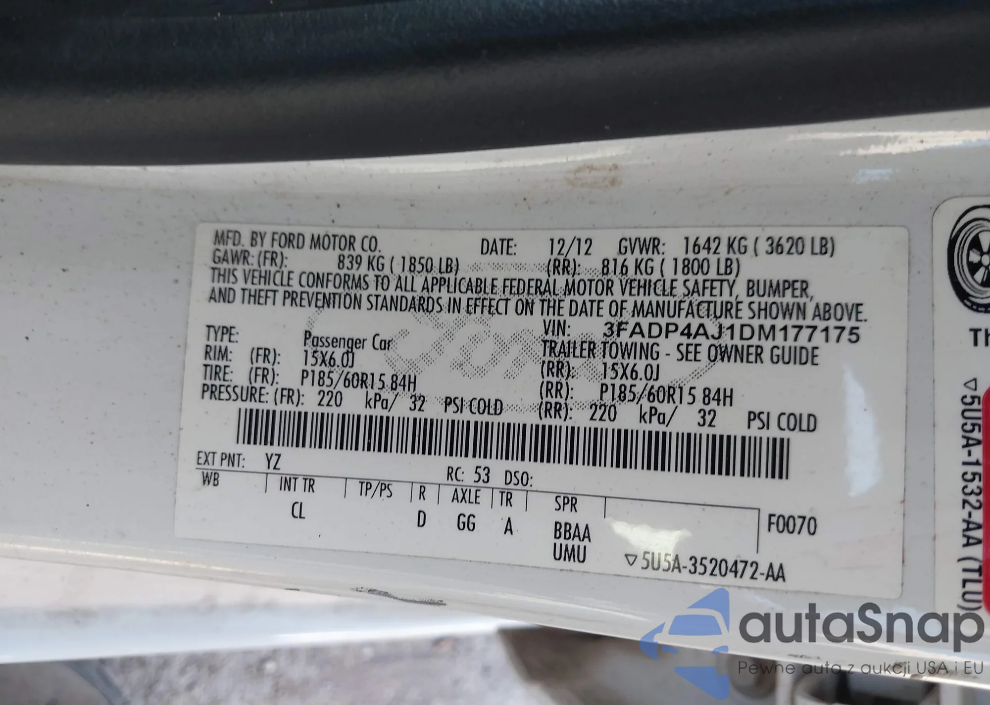 LOT: 43666056 VIN: 3FADP4AJ1DM177175