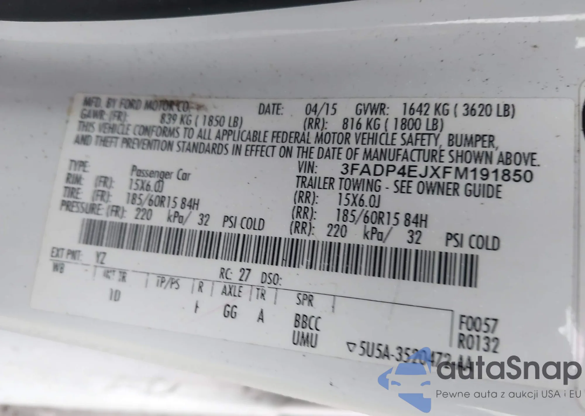 • VIN 3FADP4EJXFM191850