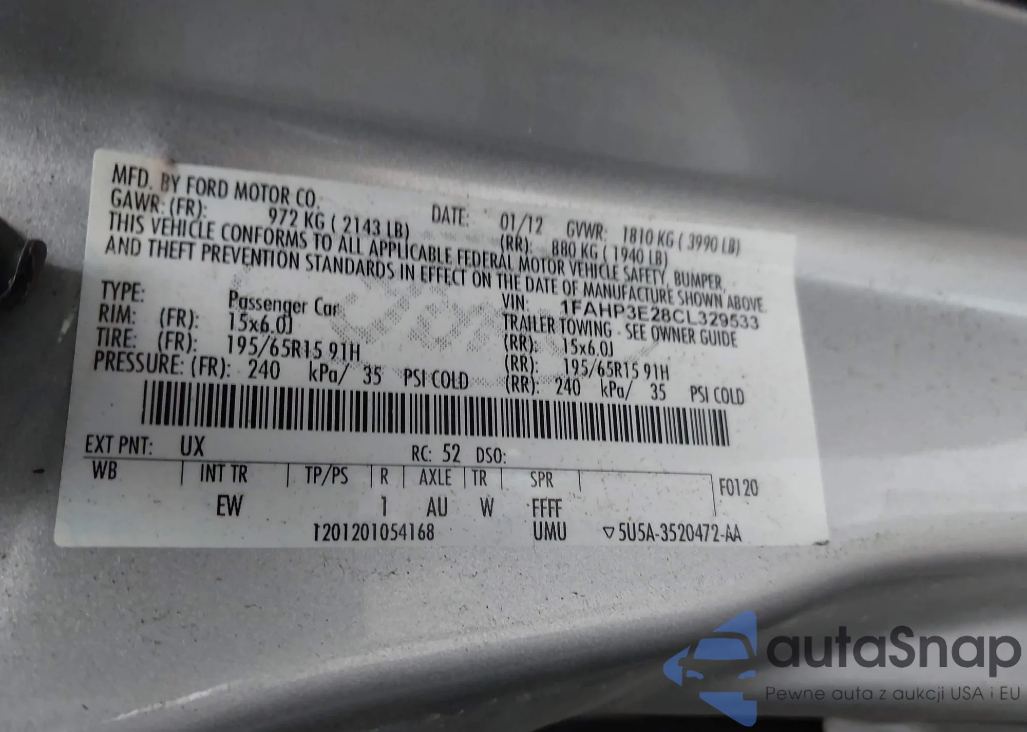 LOT: 44098115 VIN: 1FAHP3E28CL329533