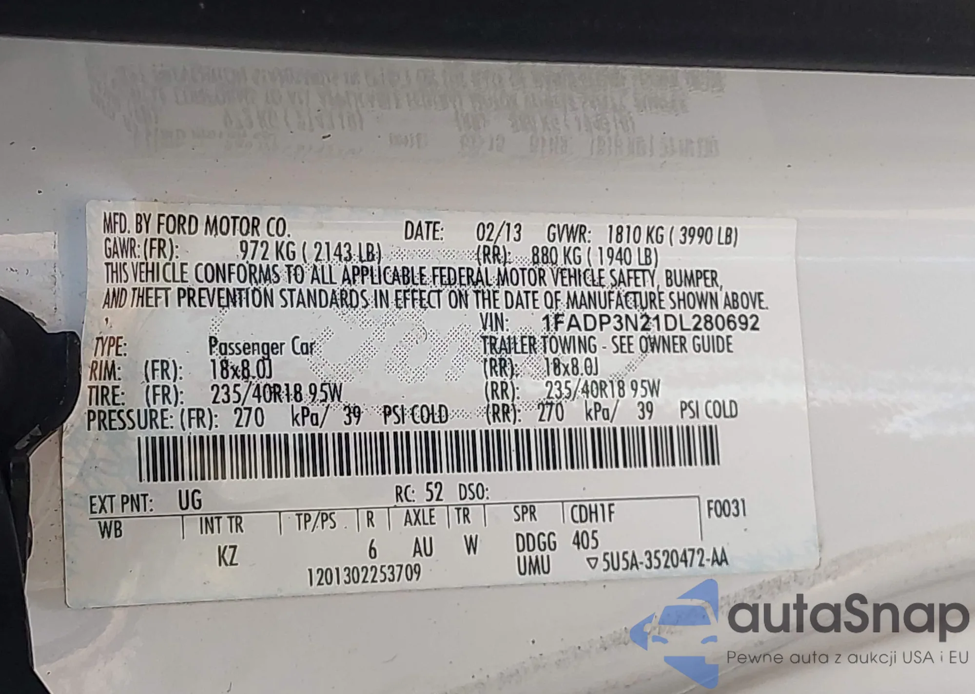 LOT: 44221021 VIN: 1FADP3N21DL280692