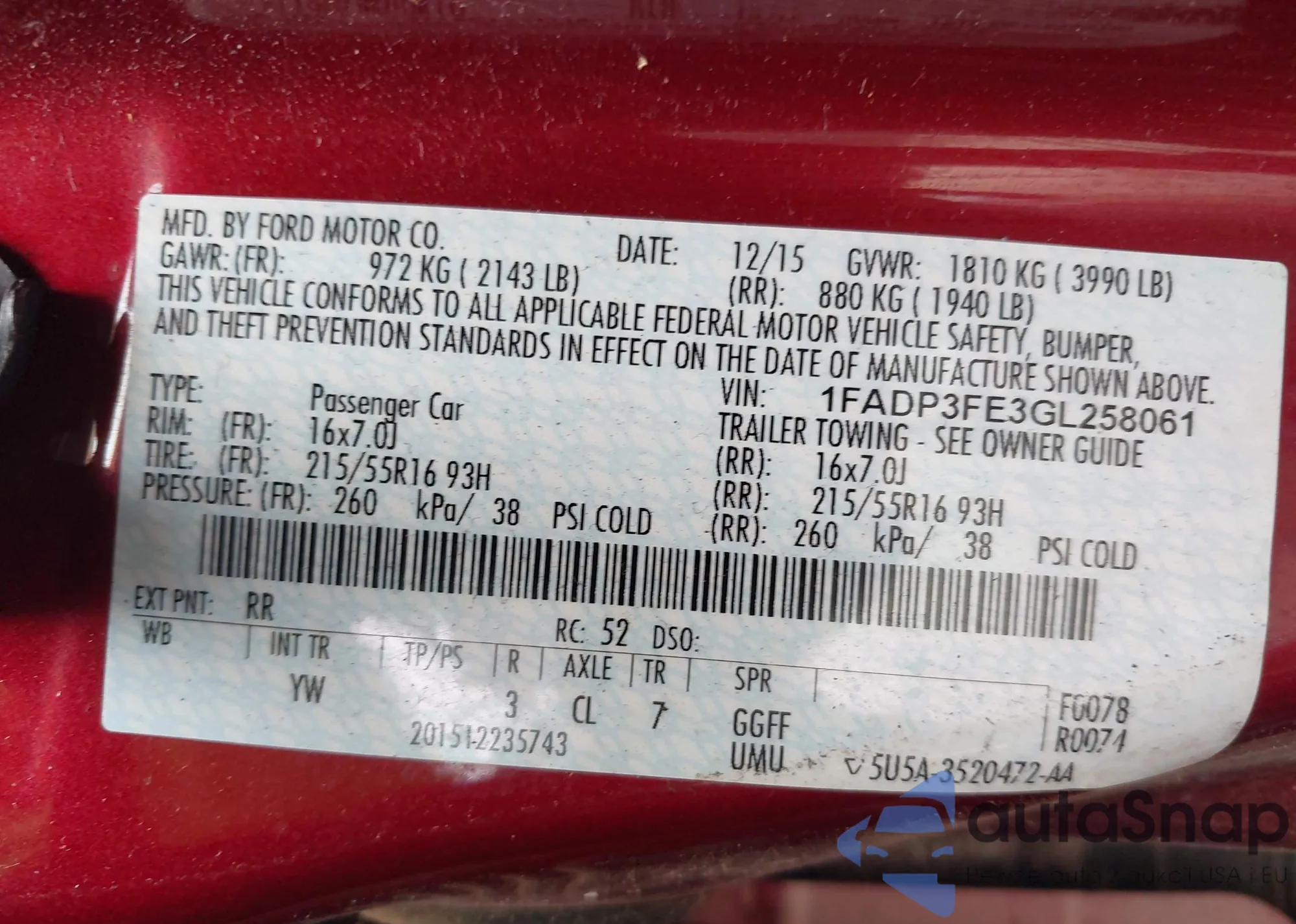 • VIN 1FADP3FE3GL258061