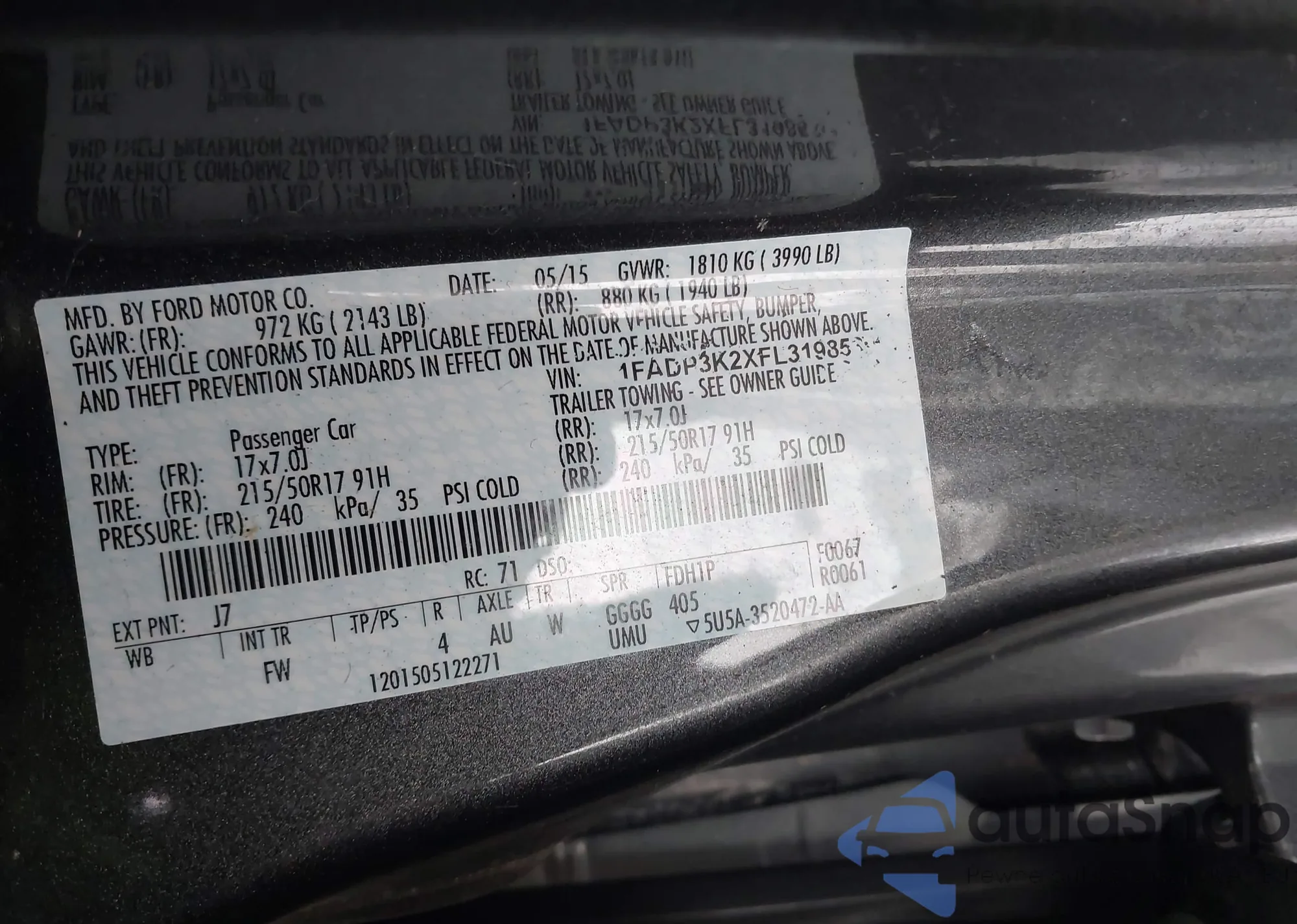 LOT: 44295957 VIN: 1FADP3K2XFL319853