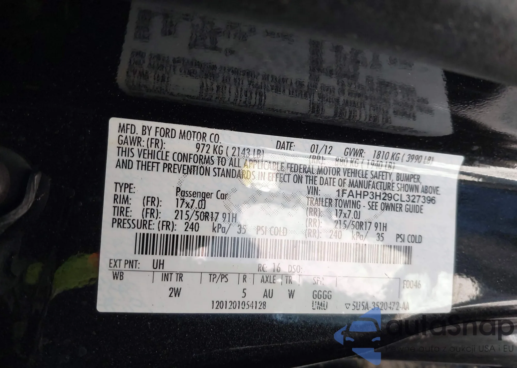 LOT: 44297952 VIN: 1FAHP3H29CL327396