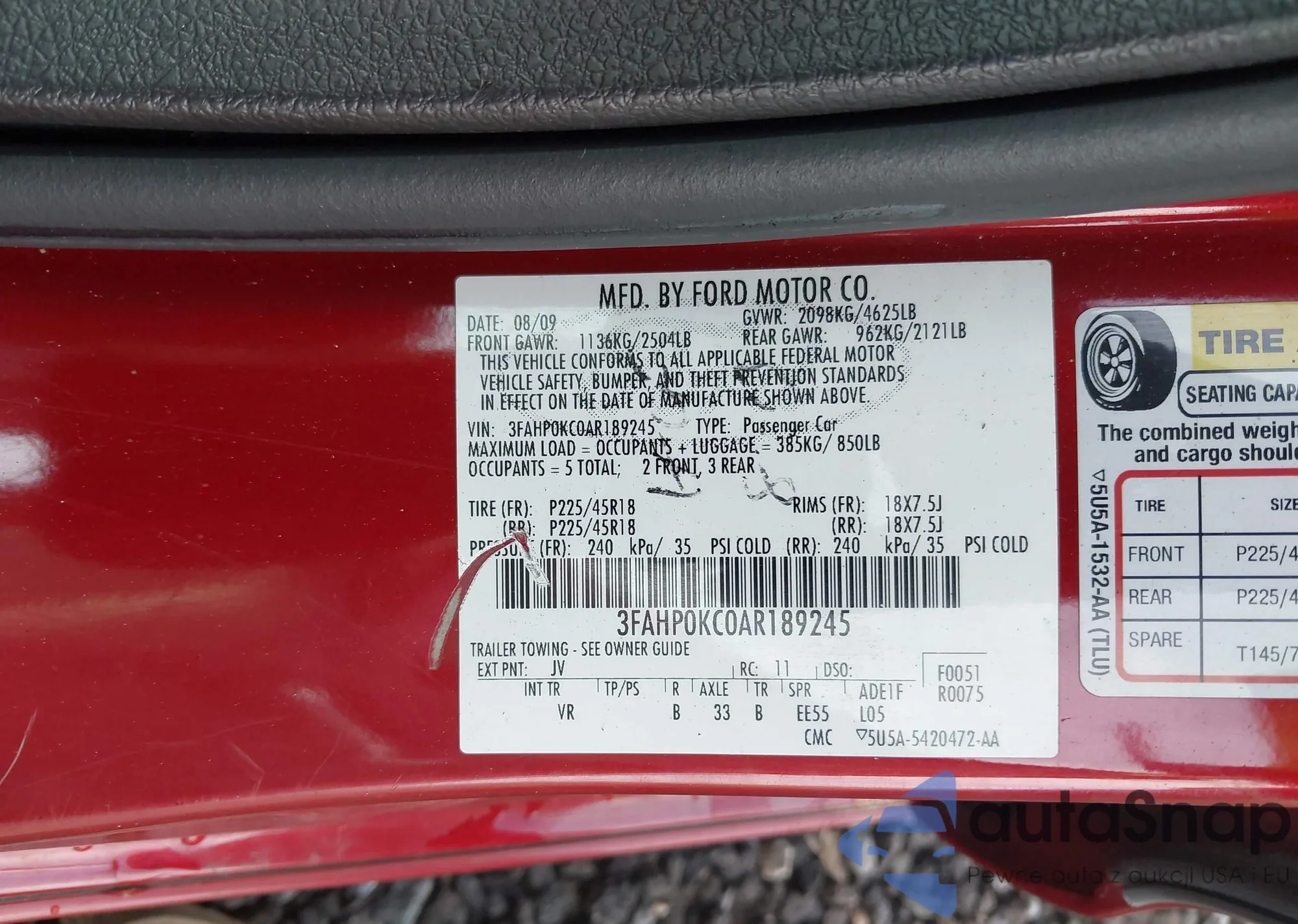 • VIN 3FAHP0KC0AR189245