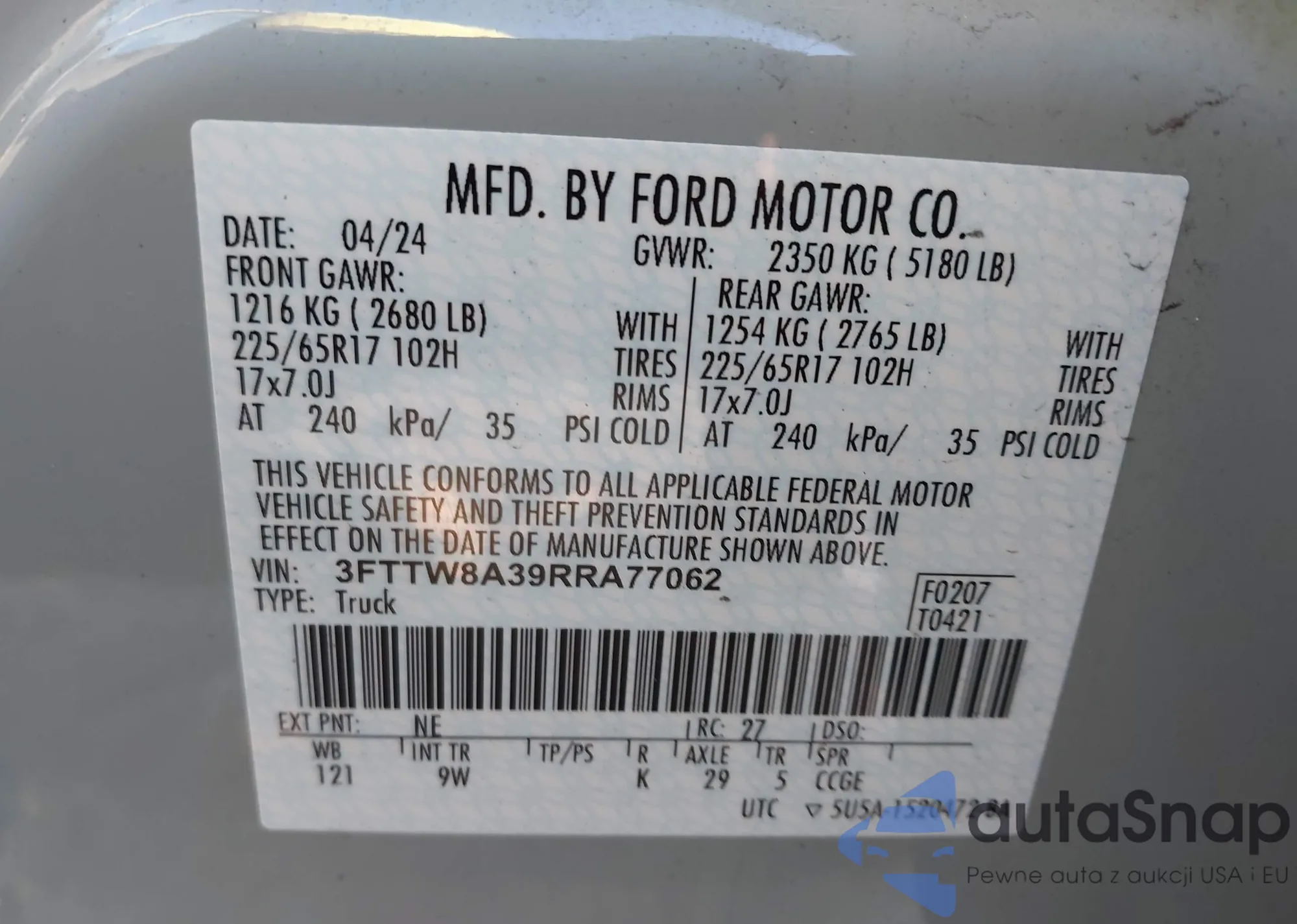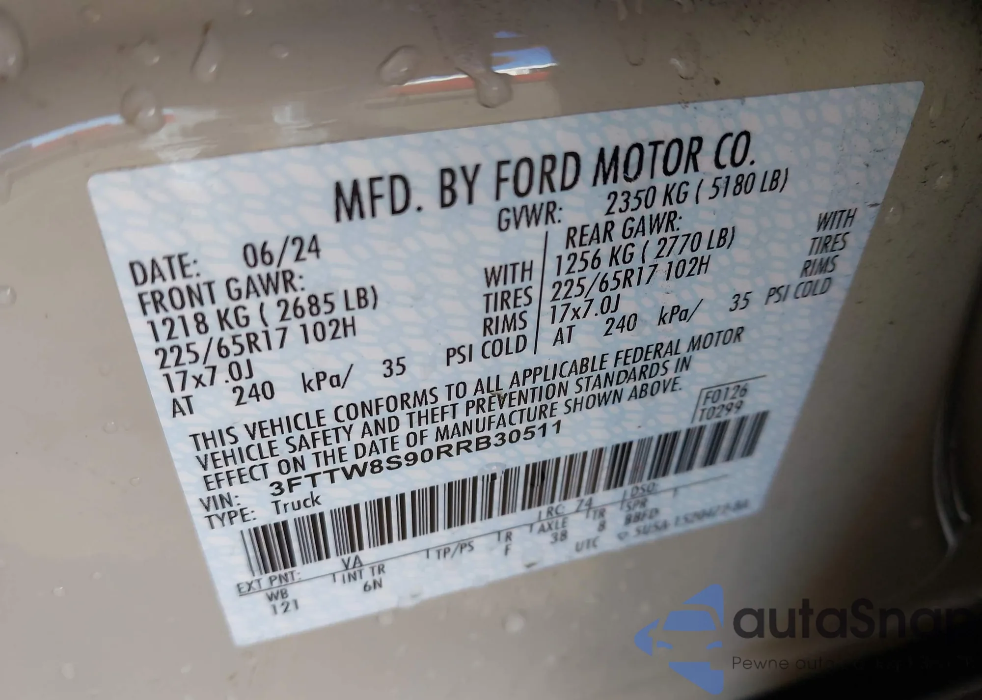 • VIN 3FTTW8B30SRA00777