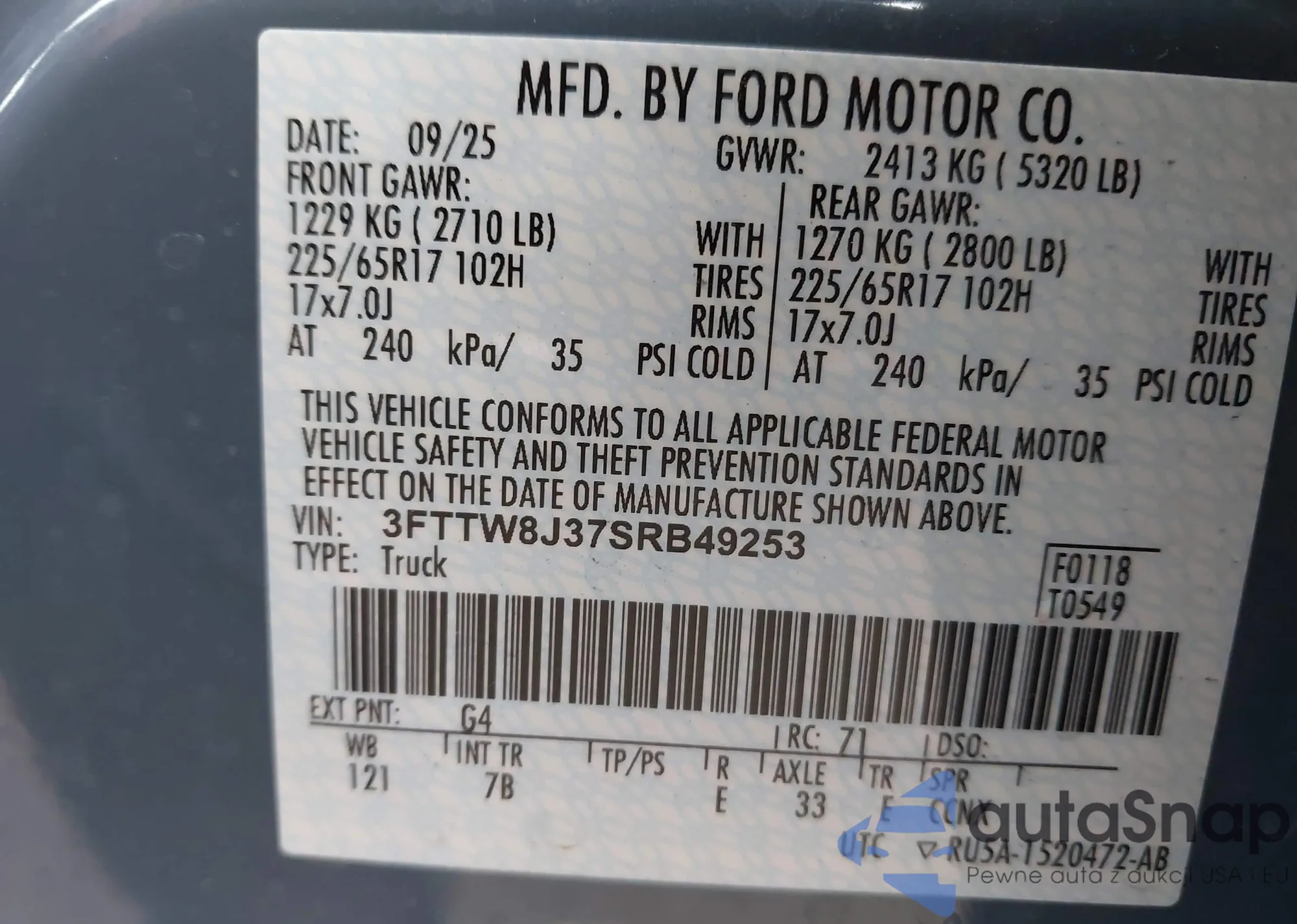 • VIN 3FTTW8J37SRB49253