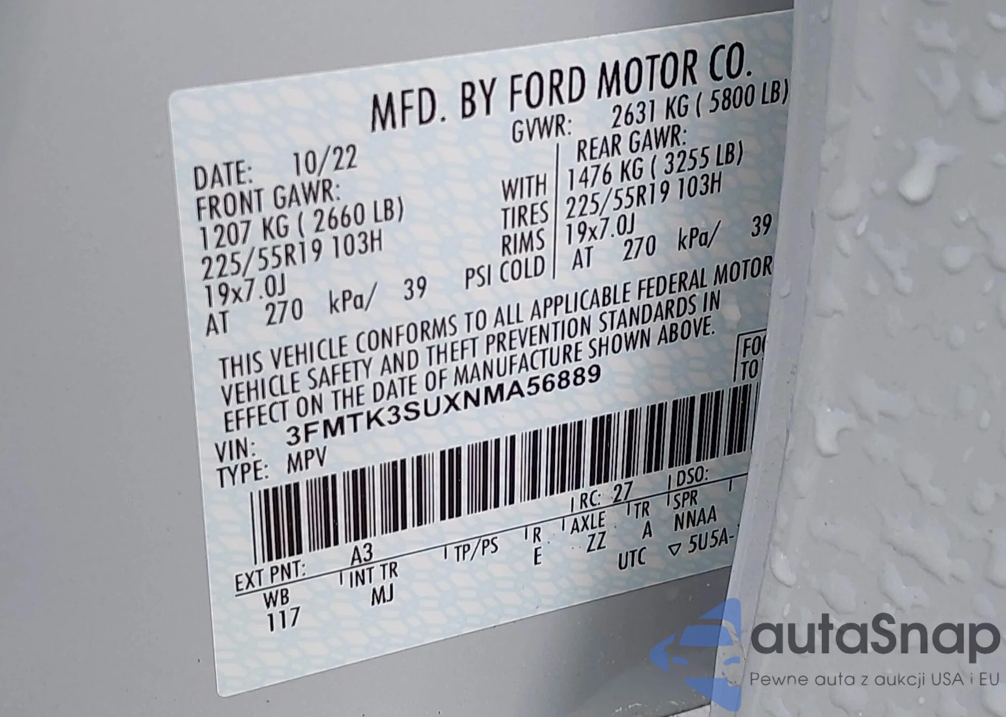 LOT: 42251786 VIN: 3FMTK3SUXNMA56889