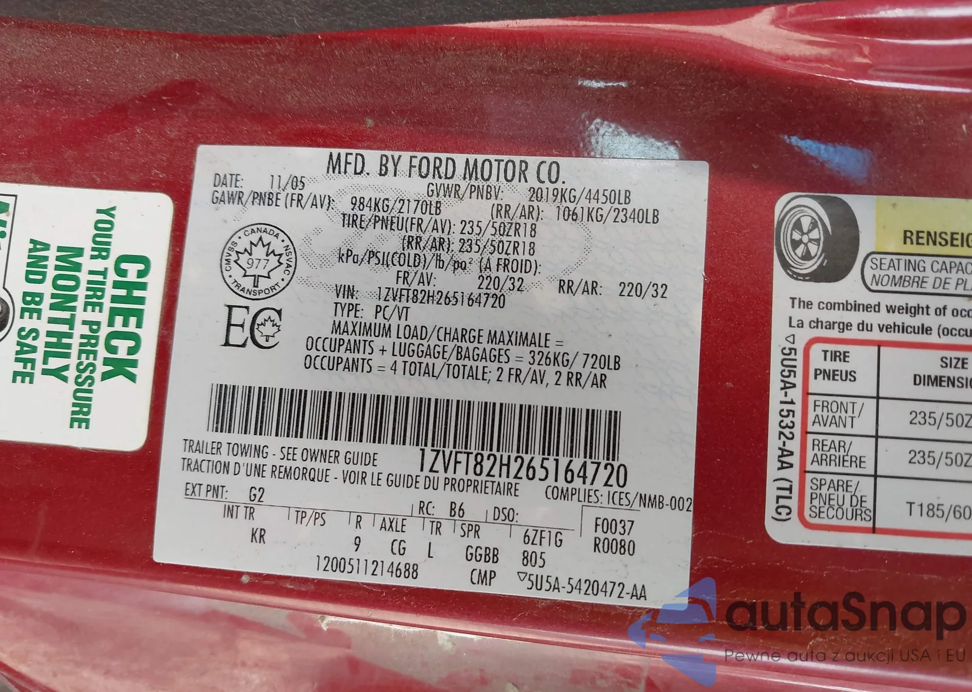 • VIN 1ZVFT82H365150874