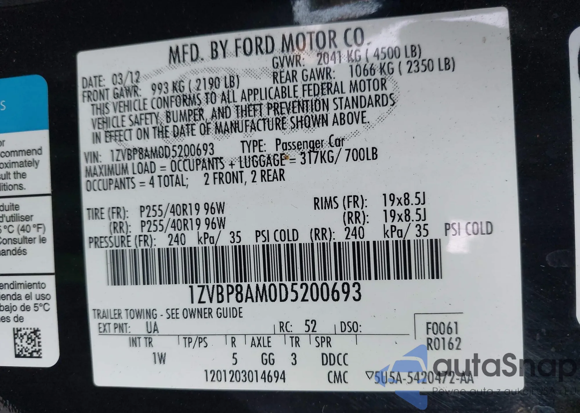 LOT: 43142507 VIN: 1ZVBP8AM0D5200693