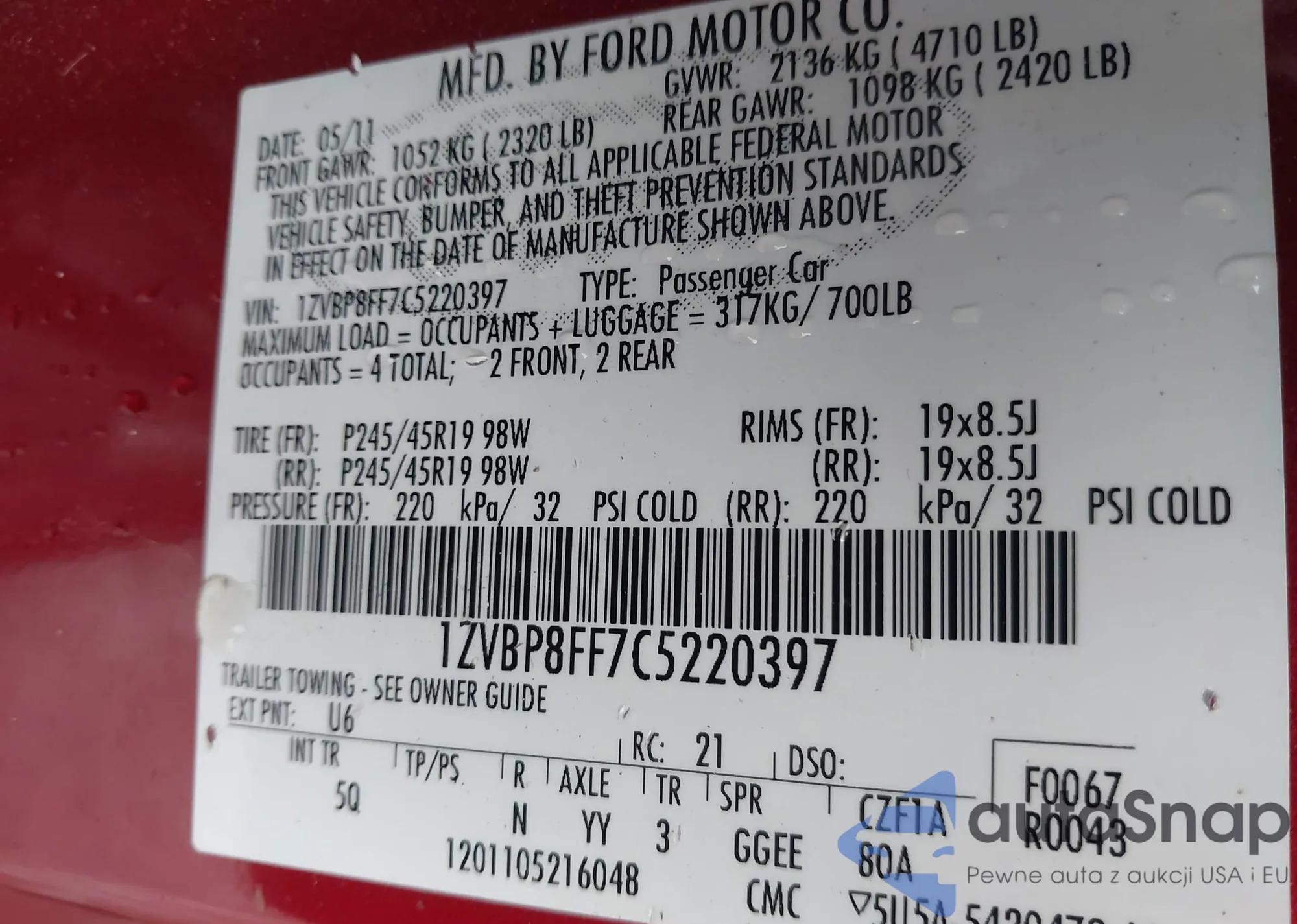 • VIN 1ZVBP8FF7C5220397