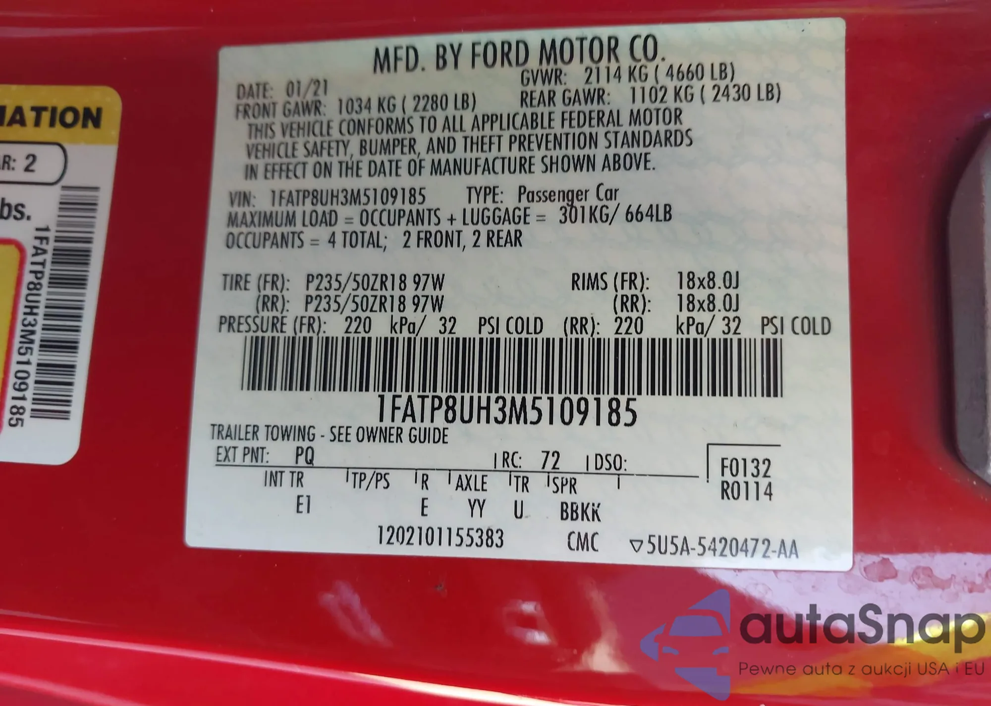LOT: 43806070 VIN: 1FATP8UH3M5109185