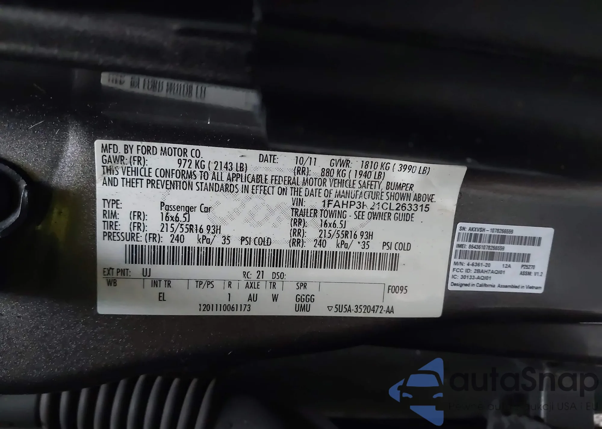 • VIN 1FAHP3K21CL263315