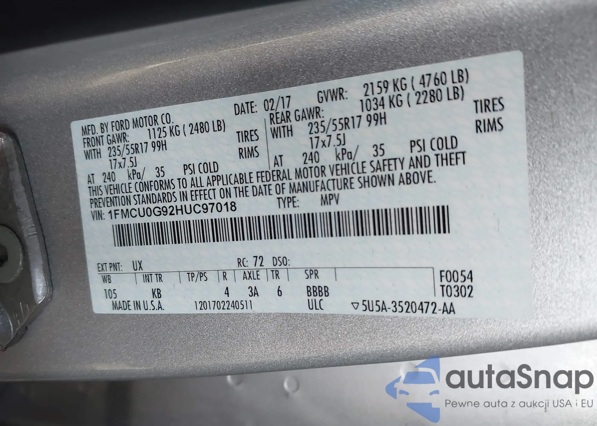 • VIN 1FMCU0G92HUC97018